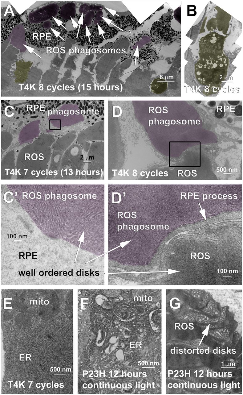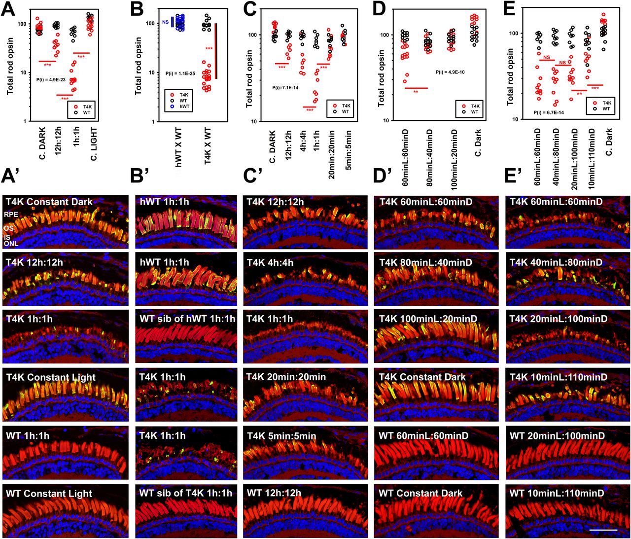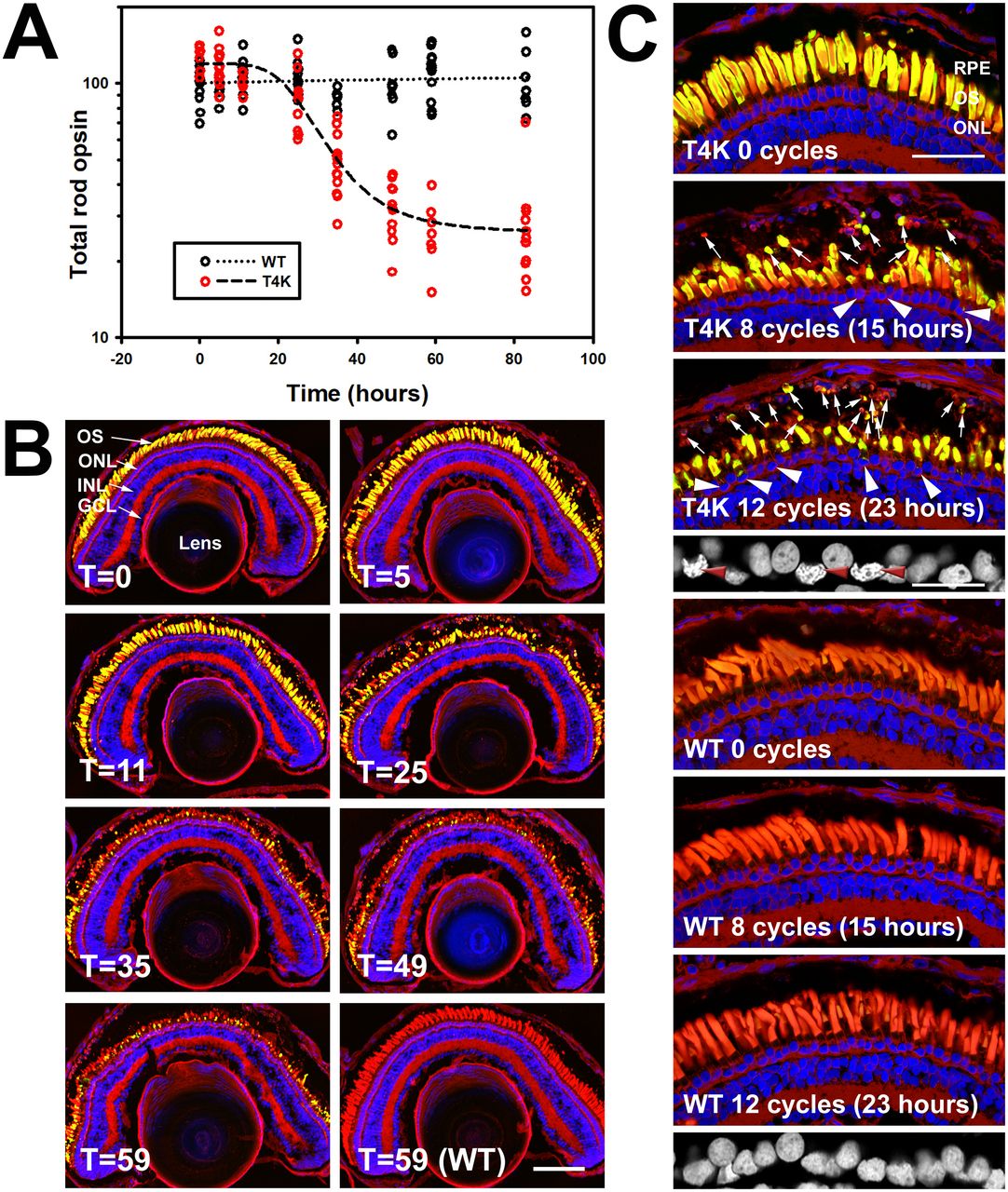 Synchronized photoactivation of T4K rhodopsin causes a chromophore-dependent retinal degeneration that is moderated by interaction with phototransduction cascade components.
