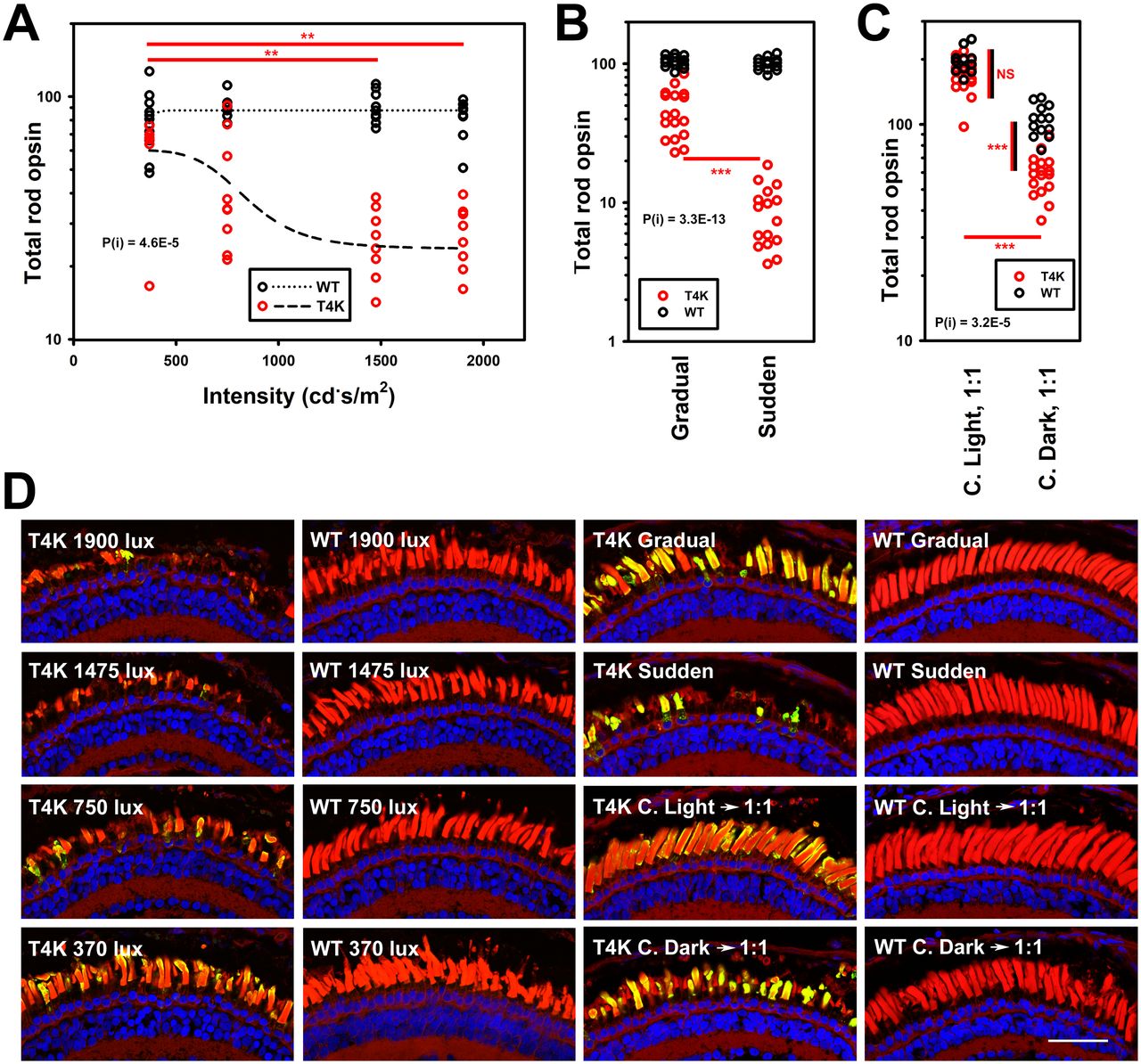 Multiple mutations in the Rhodopsin gene cause sector retinitis pigmentosa in humans and a corresponding light-exacerbated retinal degeneration (RD) in animal models. Previously we have shown that T4K rhodopsin requires photoactivation to exert its toxic effect. Here we further investigated the mechanisms involved in rod cell death caused by T4K rhodopsin in mixed male and female Xenopus laevis In this model, RD was prevented by rearing animals in constant darkness but surprisingly also in constant light. RD was maximized by light cycles containing at least one hour of darkness and 20 minutes of light exposure, light intensities > 750 lux, and by sudden light onset. Under conditions of frequent light cycling, RD occured rapidly and synchronously, with massive shedding of ROS fragments into the RPE initiated within hours, and subsequent death and phagocytosis of rod cell bodies. RD was minimized by reduced light levels, pre-treatment with constant light, and gradual light onset. RD was prevented by genetic ablation of the retinal isomerohydrolase RPE65, and exacerbated by ablation of phototransduction components GNAT1, SAG, and GRK1. Our results indicate that photoactivated T4K rhodopsin is toxic, that cell death requires synchronized photoactivation of T4K rhodopsin, and that toxicity is mitigated by interaction with other rod outer segment proteins regardless of whether they participate in activation or shutoff of phototransduction. In contrast, RD caused by P23H rhodopsin does not require photoactivation of the mutant protein, as it was exacerbated by RPE65 ablation, suggesting that these phenotypically similar disorders may require different treatment strategies.Significance Statement Many different rhodopsin mutations are linked to the inherited degenerative disease retinitis pigmentosa. Although the end result in each case is the loss of photoreceptor cells and blindness, not all mutations cause cell death via the same mechanism. In order to design and test treatment therapies that target the disease at points as upstream as possible in the process, we require detailed understanding of the range and nature of these disease mechanisms. This study using a transgenic Xenopus laevis model has extended our understanding of how T4K rhodopsin and related mutations cause rod cell photoreceptor death via a phototoxic product, and how this mechanism differs from the more extensively researched protein misfolding mechanism underlying cell death caused by P23H rhodopsin.