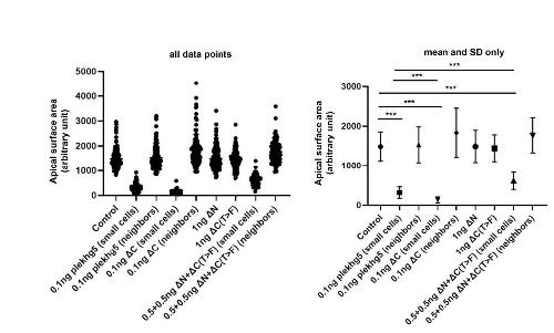 Supplemental Figure 2. Quantification of apical cell areas in embryos injected with RNAs encoding wild-type plekhg5 or its mutants. Apical cell area was measured in cleavage stage embryos when the first groups of apically constricting cells appeared. Total 80 to 200 cells from 16 embryos were analyzed for each sample. GraphPad Prism 10 software was used for statistical analysis and plotting graphs. |