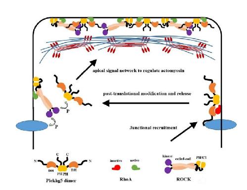 Supplemental Figure 3. Working model for Plekhg5 recruitment/retention and multivalent interactions with Rho and ROCK. The model dictates that N-terminal sequence of Plekhg5 is crucial for its recruitment to cell junctions. Activation of Rho at the cell junction leads to release of Plekhg5 from cell junction, possibly via ROCK-mediated phosphorylation. Plekhg5 is then retained at the apical cortex via an unknown mechanism. Simultaneous interactions of Plekhg5/RhoA, Plekhg5/ROCK, and RhoA/ROCK help to build a signal platform that regulates apical actomyosin dynamics in a rapid, and possibly non-linear amplification, manner. |