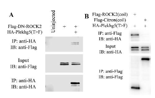 Supplemental Figure 6. Plekhg5 interacts with the Rho effector ROCK. A) Coimmunoprecipitation (IP) assay performed with HA-Plekhg5(T>F) and Flag-tagged dominant negative ROCK2 (Flag-DN-ROCK2), which contains the coiled-coil, PH and C1 domains of ROCK2, showed that Plekhg5 could pull down DN-ROCK2. B) Co-IP assay with HAPlekhg5(T>F) and Flag-tagged partial coiled-coil domain from ROCK2 or entire coiled-coil region, predicted by the AlphaFold algorithm, of human CITRON (Flag-CIT), another Rho effector, reveals that Plekhg5 interacts with the coiled-coil sequence of ROCK2 but not that of CITRON. The result implies selective interaction of Plekhg5 with a subset of Rho effectors. |