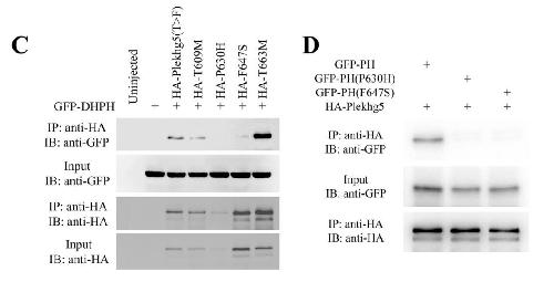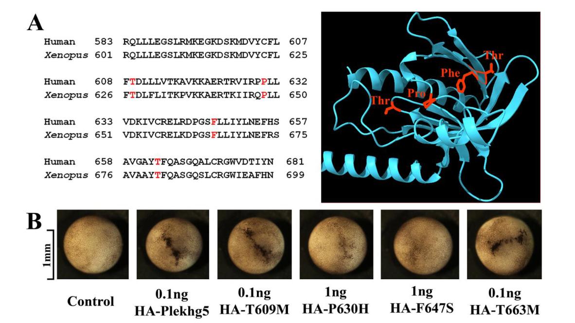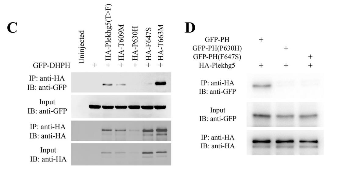 Figure 6. The PH mutants corresponding to those identified in human PLEKHG5 disease-associated variants have different abilities to induce apical constriction or self-associate. A)Sequence alignment between human and Xenopus proteins demonstrates conservation of theresidues found in disease-associated human variants in the PH domain. These residues are foundin the beta-sandwiches or the loop regions in the predicted structure of the PH domain based onthe AlphaFold model. B) Distinct abilities of the Xenopus mutants corresponding to the humanvariants in inducing apical constriction. While the T609M and the T663M mutants retained theirability to induce apical constriction, the P630H and F647S mutants showed severe reduction in inducing apical constriction. The experiments were repeated four times, with the total number ofembryos displaying apical constriction as follows: control, 0/78 embryos; 0.1 ng HA-plekhg5,50/50 embryos; 0.1 ng HA-T609M, 75/77 embryos; 1 ng HA-P630H, 5/73 embryos; 1ng HA-F647S, 0/72 embryos; and 0.1 ng HA-T663M, 88/88 embryos. C) The co-IP assay reveals thatthe P630H mutant is less stable than the wild-type protein and the F647S mutant fails toassociate with the GFP-tagged DHPH domain of Plekhg5. The RNA doses used were: 1 ngGFP-DHPH; 2 ng HA-P630H; and 0.5 ng all the rest of the HA-tagged Plekhg5 mutants. Theexperiment was repeated three times. D) Unlike the wild-type PH domain of Plekhg5, theisolated PH domains of P630H and F647S mutants cannot bind to Plekhg5. The experiment wasrepeated twice. |