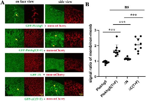 Figure 3. Localization of Plekhg5 and its mutants. A) GFP-tagged Plekhg5 and its mutantswere co-expressed with membrane-tethered mCherry (mem-mCherry) in the animal cells of earlyembryos. Examination of protein localization at early gastrula stages indicates that wild-typePlekhg5 accumulates under the apical membrane, whereas the T>F mutant is moderatelyenriched at the cell junction. Deletion of the C-terminal region enhances junctional recruitmentof the C(T>F) mutant as well as its ectopic localization to the basolateral compartment of outerepithelial cells and cell-cell contacts of the inner cells. Deletion of the N-terminal sequenceresults in more diffuse distribution of the N mutant. The experiments were repeated three timesfor en face view samples and twice for side view samples, with the total number of imagedembryos as follows: 0.1-0.2 ng GFP-Plekhg5, 14 en face view and 6 side view samples; 0.2-0.5ng GFP-Plekhg5(T>F), 13 en face view and 12 side view samples; 0.5 ng GFP-N, 13 en face view and 14 side view samples; and 0.5 ng GFP-C(T>F), 13 en face view and 12 side viewsamples. Arrows indicate signals under the apical surface of plekhg5-expressing cells orenriched at the cell junctions of cells expressing plekhg5(T>F) orC(T>F) in the en face view,whereas arrowheads point to ectopic signals in the basolateral compartment of outer epithelialcells and at the cell-cell contacts of inner cells in the side view. B) Quantification of GFP signalsat cell contacts versus in the non-junctional areas in samples with en face views support theobservation of junctional enrichment of the T>F mutants. A total of 9 samples from threeexperiments were analyzed for each sample group. *** indicates p-value less than 0.001, and nsmeans non-significant with the p-value = 0.06 between the indicated groups. |