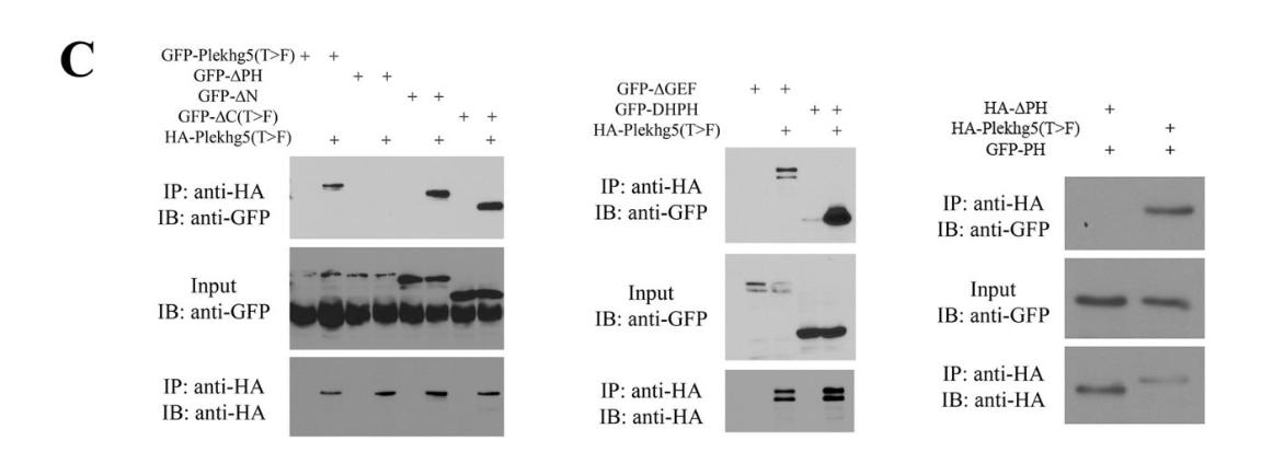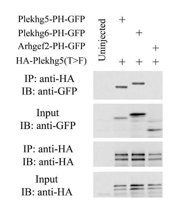 Supplemental Figure 4. Specificity of PH domain-mediated association of RhoGEFs. Coimmunoprecipitation assay was performed to examine interactions of Plekhg5(T>F) with the GFP-tagged PH domains from Plekhg5, Plekhg6, and Arhgef2 (a.k.a. GEF-H1). While Plekhg5(T>F) can interact with the PH domains of Plekhg5 and Plekhg6, it does not bind the PH domain of Arhgef2, indicating that PH domain-mediated association of RhoGEFs is specific to a subset of the family members. |