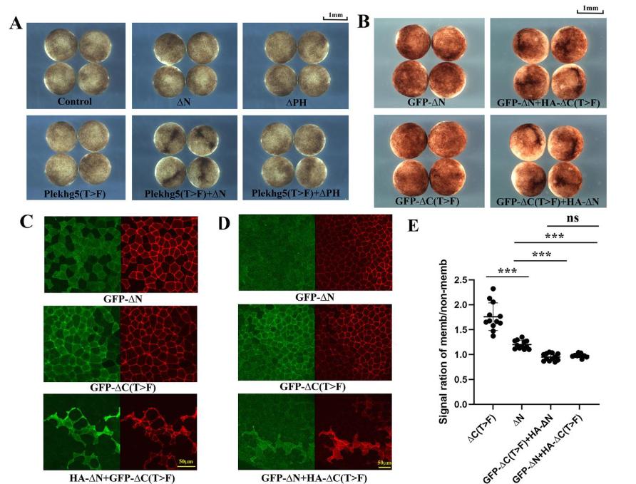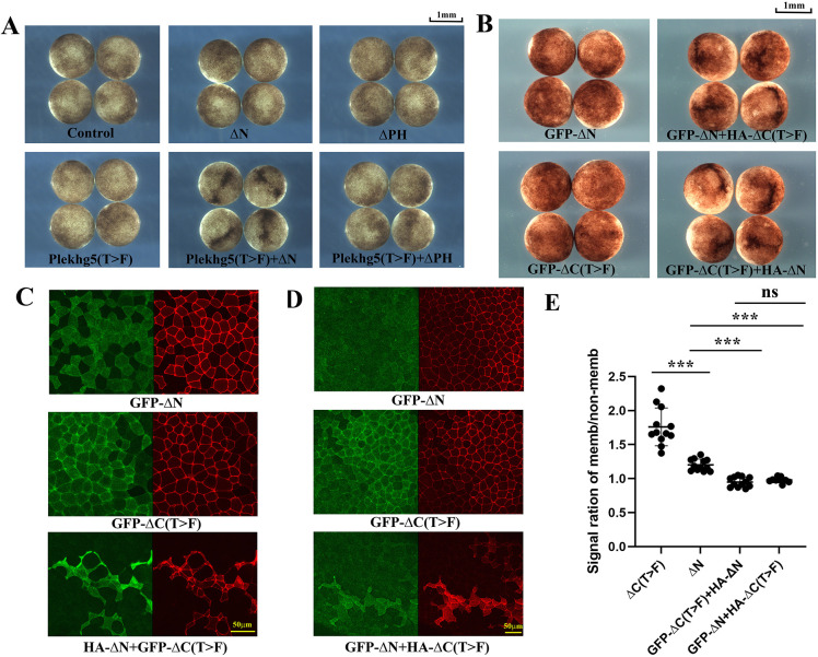 Figure 4. Functional complementation of localization-impaired and GEF-defective mutantswith co-expression. A) Complementation of the Plekhg5(T>F) mutant with the localizationdefective N, but not the PH, mutant in inducing apical constriction. The experiment wasrepeated twice, with the total number of embryos displaying apical constriction as follows: control, 0/24 embryos; 1 ng N, 0/24 embryos; 1 ng PH, 0/24 embryos; 1 ng Plekhg5(T>F),0/24 embryos; 0.5+0.5 ng Plekhg5(T>F)+N, 24/24 embryos; and 0.5+0.5ngPlekhg5(T>F)+PH, 0/24 embryos. B) The N and the C(T>F) mutants functionallycomplement to induce apical constriction. The experiment was repeated four times, with thetotal number of embryos displaying apical constriction as follows: control, 0/50 embryos; 1 ngGFP-N, 0/66 embryos; 1 ng GFP-C(T>F), 0/66 embryos; 0.5+0.5 ng GFP-N+HA-C(T>F),62/62 embryos; and 0.5+0.5 ng GFP-C(T>F)+HA-N, 63/63 embryos. C, D) Rescue of apicalcortex localization of the GFP-tagged mutants when they are co-expressed with the other mutantthat could restore junctional recruitment or a functional GEF domain via self-association. Theexperiments were repeated three (panel D) to four (panel C) times, with the total number ofembryos imaged with the shown patterns as follows: 0.5 ng GFP-N, 22/22 samples; 0.5 ngGFP-C(T>F), 21/21 samples; 0.25+0.25 ng or 0.5+0.5 ng GFP-N+HA-C(T>F), 15/18samples; and 0.25+0.25 ng or 0.5+0.5 ng GFP-C(T>F)+HA-N, 23/24 samples. E)Quantification of GFP signal at the cell membrane and non-membrane areas indicated astatistically significant difference between mutant alone and the rescued groups. *** indicates p-value less than 0.001, and ns means non-significant with the p-value = 0.24 between theindicated groups. |