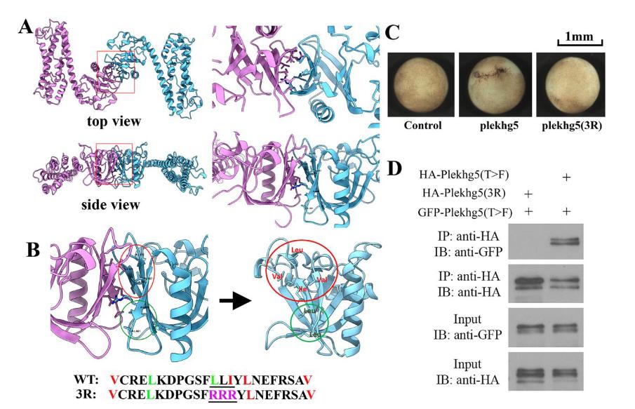 Figure 5. Computational modeling of Plekhg5 DH/PH domains as a dimer. A) Homologymodeling based on the structure of Arhgef11 reveals PH-mediated dimerization of the DH andPH domains of Plekhg5. B) Two groups of amino acids (red and green) are identified to bepotentially important for self-association at the DH/PH dimer interface. Mutagenesis of 3hydrophobic residues into charged arginine is indicated in the sequence. C) The 3R mutantcannot induce apical constriction. The experiment was repeated three times, with the totalnumber of embryos displaying apical constriction as follows: control, 0/24 embryos; 0.1 ngplekhg5, 32/32 embryos; 1 ng plekhg5(3R), 0/40 embryos. D) When expressed at the similarprotein level to Plekhg5(T>F), with RNA doses of 0.5 ng HA-plekhg5(T>F) and 2 ng HA-plekhg5(3R), the 3R mutant fails to self-associate in the co-IP assay. The experiment wasrepeated three times. |
