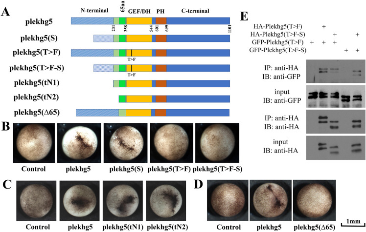 Figure 1. Both long and short isoforms of Plekhg5 induce apical constriction and can self-associate. A) Schematic representation of Plekhg5 isoforms, T>F mutants, and the deletionmutants. The long isoform corresponds to the NCBI protein with the accession numberXP_018083458, whereas the short isoform has the accession number of XP_018083456. B)Induction of apical constriction by the wild-type (total 0.1 ng RNA), but not the T>F mutants(total 1 ng RNA), plekhg5 isoforms. The experiment was repeated three times, with the totalnumber of embryos displaying apical constriction as follows: control, 0/28 embryos; 0.1 ngplekhg5, 28/28 embryos; 0.1 ng plekhg5-S, 28/28 embryos; 1 ng plekhg5(T>F), 0/39 embryos;and 1 ng plekhg5(T>F-S), 0/33 embryos. C) Removal of the divergent N-terminal sequences inthe isoforms (tN1 mutant) and including the first 44 amino acids in the overlapping region upstream of the GEF/DH domain (tN2 mutant) does not impair the ability of the mutants toinduce apical constriction. The experiment was repeated three times, with the total number ofembryos displaying apical constriction as follows: control, 0/42 embryo; 0.1 ng plekhg5, 23/23embryos; 0.1 ng plekhg5(tN1), 44/44 embryos; and 0.1 ng plekhg5(tN2), 51/51 embryos. D)Deletion of the 65 amino acids in the region common to long and short isoforms upstream of theGEF/DH domain leads to loss of induction of apical constriction by the mutant. The experimentwas repeated three times, with the total number of embryos displaying apical constriction asfollows: control, 0/38 embryos; 0.1 ng plekhg5, 26/26 embryos; and 1 ng plekhg5(65), 0/45embryos. E) Both long and short isoforms of Plekhg5 can self-associate. HA- and GFP-taggedPlekhg5(T>F) or Plekhg5(T>F-S) were co-expressed at the RNA doses of 0.5 to 1 ng for eachgene in early Xenopus embryos. Co-IP studies were performed using embryonic lysate obtainedat gastrula stages. Co-IP signals were detected by Western blot analysis. The experiment wasrepeated three times. IP: immunoprecipitation; IB: immunoblotting. |