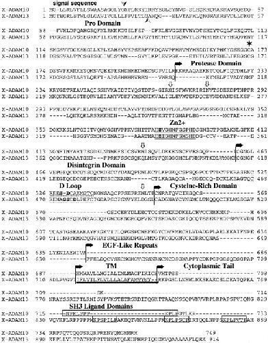Figure 2. Sequence comparison of X-ADAM10 and X-ADAM13. Amino acid sequence alignments of full-length ADAM10 (GenBank/EMBL/DDBJ accession no. AF508151) and ADAM13 (accession no. U66003) with domain boundaries in black. The putative signal sequences are shown with an arrowhead. The cysteine-switch cysteine is indicated by a star (★) and all potential N-linked glycosylation sites in ADAM10 are denoted with an open arrow (⇓). The metalloprotease active site is underlined by a solid black line, the disintegrin loop is underlined by a broken line, and the transmembrane (TM) domain is underlined with a wavy line. All putative SH3 binding sites in the cytoplasmic tails of ADAMs 10 and 13 are boxed. Mutated amino acids in the zinc binding site (ADAM13 E341 to A; ADAM10 E385 to A) and the disintegrin loop (ADAM10 S529 to A and D530 to A; ADAM13 G474 to A, S475 to A, and D477 to A) are highlighted in bold.