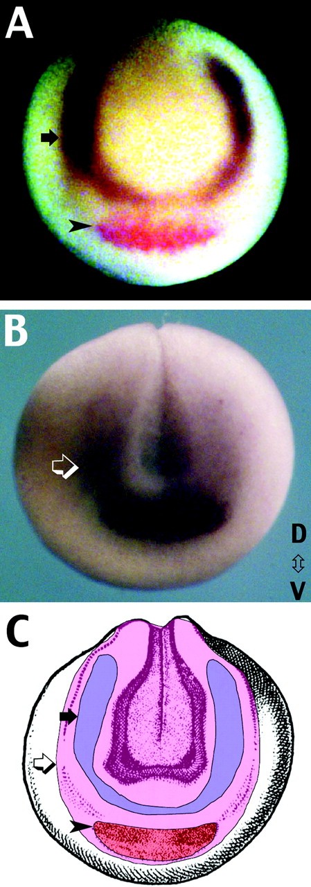 Figure 3. Localization of ADAM13, ADAM10, and XCG mRNA in early Xenopus embryos. (A) In an anterior view at stage 16, ADAM13 (purple, black arrow) mRNA is found in the neural crest and just dorsal to the cement gland anlagen (as marked by XCG mRNA expression in red, arrowhead), but the two transcripts do not overlap. (B) ADAM10 (light purple, open arrow) mRNA is localized to the entire neural plate and placodes, and encompasses the expression field of XCG. No distinct red color revealing XCG mRNA expression is seen because it is overlaid by the light purple ADAM10 costaining. (C) In a schematic of the Xenopus embryo at stage 16, the pink represents the entire neural plate and surrounding placodal and cement gland anlagen that express ADAM10 mRNA (open arrow). The ADAM10-expressing area encompasses both the regions of ADAM13 mRNA expression (blue, black arrow) and XCG (red, arrowhead) (Nieuwkoop and Faber, 1994).