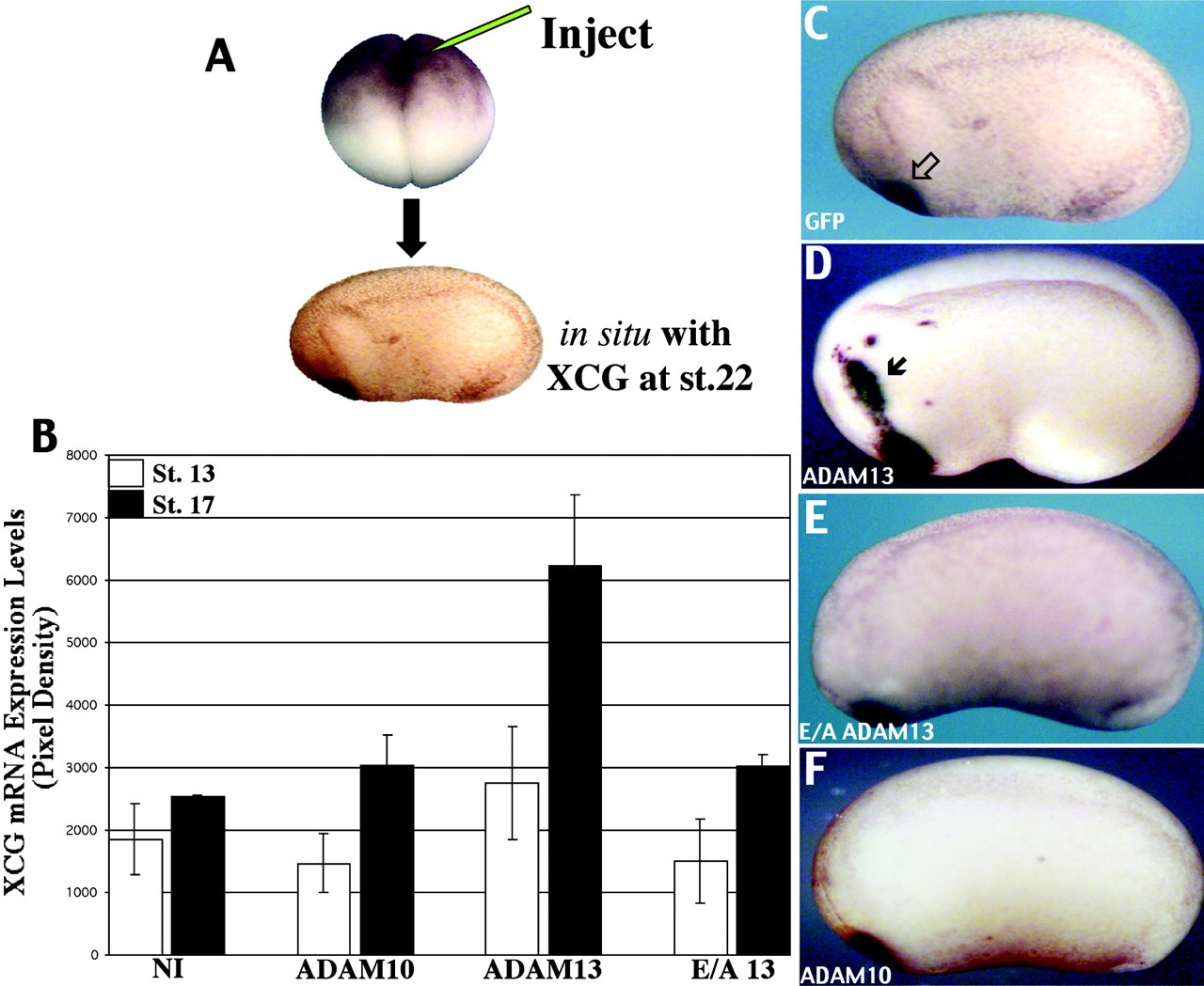 Figure 4. Overexpression of wild-type ADAM13, but not ADAM10, results in hyperplasia of the cement gland. (A) Transcripts encoding ADAM constructs are microinjected into the animal pole of one blastomere at the two-cell stage. The embryos are allowed to recover until stage 22+, and then fixed for whole mount in situ hybridization with the cement gland marker XCG. (B) The increase in XCG mRNA levels caused by ADAM13 overexpression was quantified by RNA spot blot. Data are represented as relative values of expression based on average pixel densities obtained using the PhosphorImager. All levels of expression were within the linear range of this detection method. Data are shown as means ± SD of five independent experiments, each with pooled RNAs from 10 embryos. By stage 17, a twofold increase in XCG mRNA levels (P < 0.05) was found in embryos expressing ADAM13, but not E/A ADAM13 or ADAM10. The differences in XCG mRNA levels quantified by RNA spot blot were also observed by whole mount in situ hybridization. (C) GFP-injected embryos had no alterations in the cement gland marker XCG (black arrow), whereas large, ectopic islands of XCG-positive cells (D, arrow) were found when overexpressing ADAM13. Expression of the E/A ADAM13 mutant (E) or ADAM10 (F) had no affect on cement gland formation. NI, noninjected control; E/A13, E/A ADAM13.