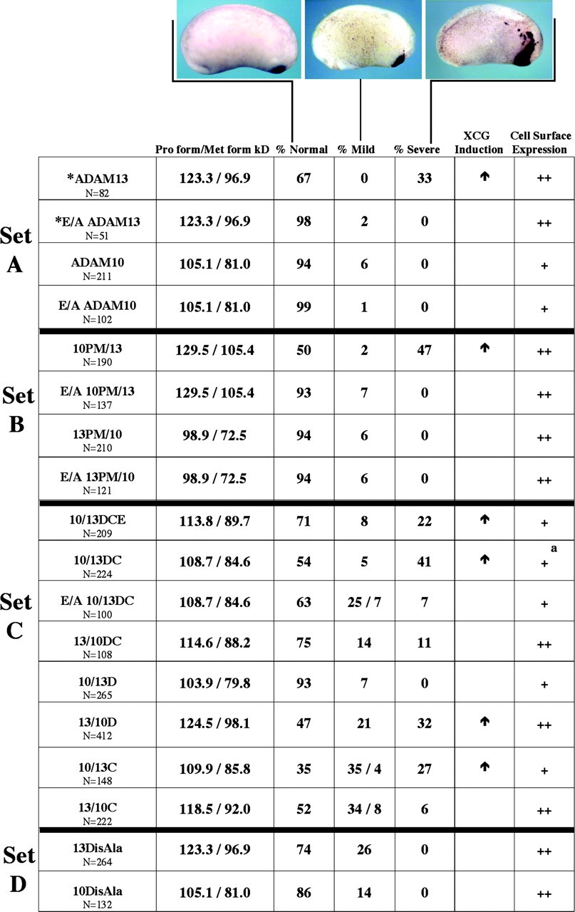 Figure 7. Summary of ADAM10/13 construct expression in embryos. The molecular weights in kD were calculated by MacVector software and include the addition of the six myc tags and predicted N-linked glycosylations. After in situ hybridization with XCG, embryos were scored for mild or severe cement gland perturbations. The embryos with mild phenotypes were subdivided into two classes, in some cases (shown with a back slash), defined as one to three small spots of ectopic XCG expression or three to four small spots accompanied by <10% expansion of the area of the main cement gland. Severe phenotypes had numerous large islands of ectopic cement gland or substantial expansions (>10%) of the existing cement gland. Up arrows indicate the ability of a construct to induce severe cement gland hyperplasia (corresponding to arrows in Fig. 5). Constructs with high levels of cell surface expression in the met form (as compared with ADAM13) have two pluses (++) and embryos with lower levels of met forms are given one plus (+). N, the number of embryos assayed. aLow cell surface expression, but robust activity. *Previously we reported separate experiments involving the coexpression of equal amounts of transcript (0.5 ng each) encoding wild-type and E/A ADAM13, which led to a marked reduction (62%) in cement gland hyperplasia. We conclude that E/A ADAM13 can function as a dominant-negative inhibitor of wild-type ADAM13 in the cement gland assay; the details are reported in Alfandari et al. (2001).