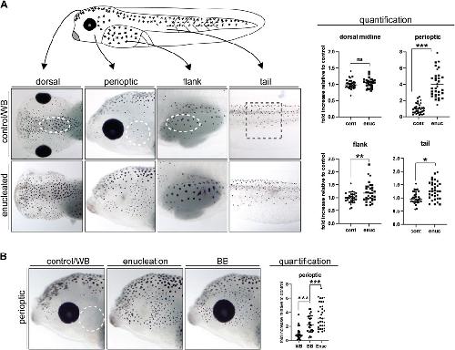 Xenuc = 1.29 0.06; mean s.e.m.; ncnt = 32, nenuc = 33; N = 4) (B) The impact of 24 h exposure to a black background (BB) on perioptic melanophore number was examined. When compared to white background (WB)-exposed controls, BB-treated larvae showed a significant increase in perioptic melanophores, although enucleated larvae displayed an even greater increase in these cells. (Xcnt/WB = 1.00 0.13, XBB = 2.34 0.20, Xenuc = 3.56 0.32; F3,96 = 30.42, p < 0.0001, one-way ANOVA) n. s., not significant, *p < 0.05, **p < 0.001, ***p < 0.0001, unpaired two-tailed Students t-test (A), and Tukeys (B). |