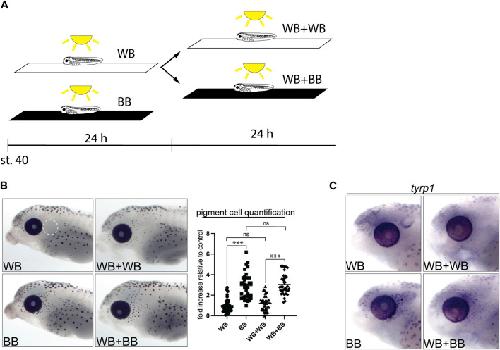 WB+BB = 3.04 ± 0.17, nWB+BB = 36; N = 4; F3, 136 = 46.11, p < 0.0001, one-way ANOVA). (C) WMISH for tyrp1 in the perioptic area for the four conditions. ***p < 0.0001, Tukey’s test. |