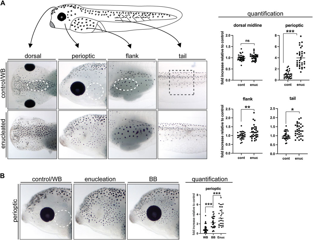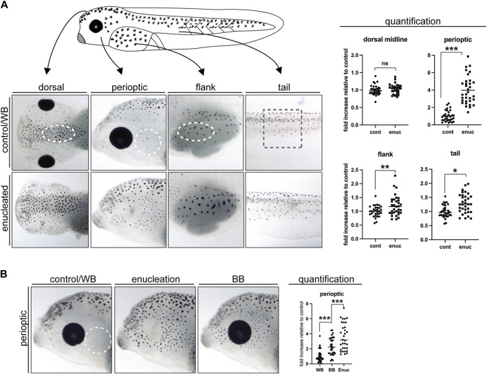 = 33; N = 4) (B) The impact of 24 h exposure to a black background (BB) on perioptic melanophore number was examined. When compared to white background (WB)-exposed controls, BB-treated larvae showed a significant increase in perioptic melanophores, although enucleated larvae displayed an even greater increase in these cells. (