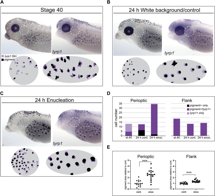 Figure 4. Loss of visual input increases tyrp1 expression and perioptic melanophore differentiation. (A–C) tyrp1 mRNA compared to pigmentation for each larva by overlaying WMISH and pigment aggregate images (illustrated in circle and oval schematics for perioptic and flank areas, respectively) at stage 40 (A), after 24 h on a white background (B), and 24 h post-enucleation (C). (D) Average number of pigmented + only, pigmented+/tyrp1+, and tyrp1+ only cells for each condition shown in A-C for the perioptic area and flank. White dashed circle (perioptic region) and oval (flank) indicate analysis regions. (Perioptic-st.40: