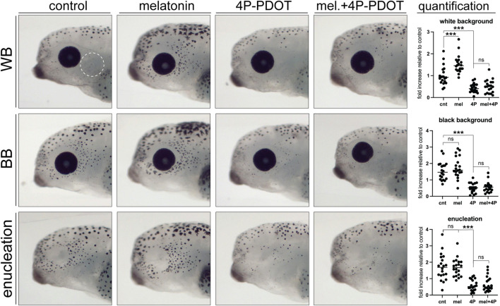 Figure 7. Melatonin signalling is necessary and sufficient to induce perioptic melanophore differentiation. Stage 40 larvae underwent sham surgery and were maintained in the light on a white background or black background, or were enucleated. Larvae from each condition were exposed to control, melatonin, melatonin receptor antagonist (4P-PDOT), or melatonin and 4P-PDOT solutions for a 24-h period. Melanophore numbers in the perioptic region (white dashed circle) were compared; White background:
