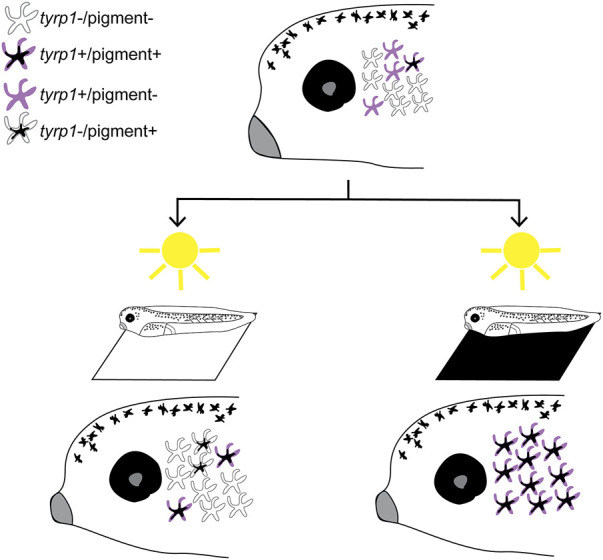 FIGURE 8. Model of vision-mediated melanophore differentiation. At stage 40 (top), as the visual system becomes functional, four related perioptic melanophores exist: 1) differentiated pigment+/tyrp1+, 2) differentiating tyrp1+/pigment-, 3) immature tyrp1-/pigment-awaiting a signal to differentiate, and 4) de-differentiating tyrp1-/pigment+. Light on a white background (bottom left) produces a small increase in pigmented cells, but tyrp1+ cells (pigmented and non-pigmented) decrease. Light on a black background (or 24 h enucleation; bottom right) dramatically increases pigmented and tyrp1+ melanophores. A black background drives differentiation of the tyrp1-/pigment-population into mature pigmented melanophores. |
