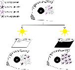 Figure 8. Model of vision-mediated melanophore differentiation. At stage 40 (top), as the visual system becomes functional, four related perioptic melanophores exist: 1) differentiated pigment+/tyrp1+, 2) differentiating tyrp1+/pigment-, 3) immature tyrp1-/pigment-awaiting a signal to differentiate, and 4) de-differentiating tyrp1-/pigment+. Light on a white background (bottom left) produces a small increase in pigmented cells, but tyrp1+ cells (pigmented and non-pigmented) decrease. Light on a black background (or 24 h enucleation; bottom right) dramatically increases pigmented and tyrp1+ melanophores. A black background drives differentiation of the tyrp1-/pigment-population into mature pigmented melanophores. |