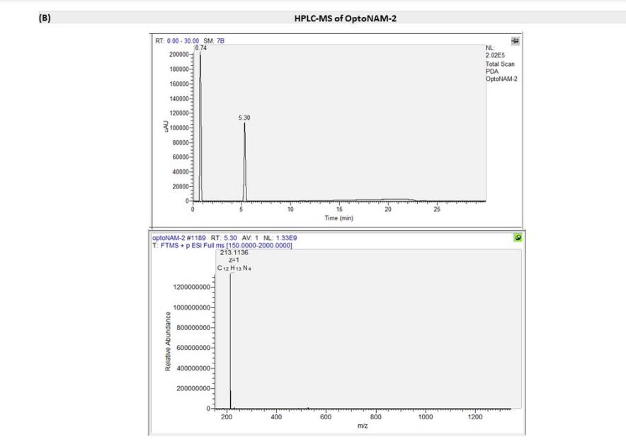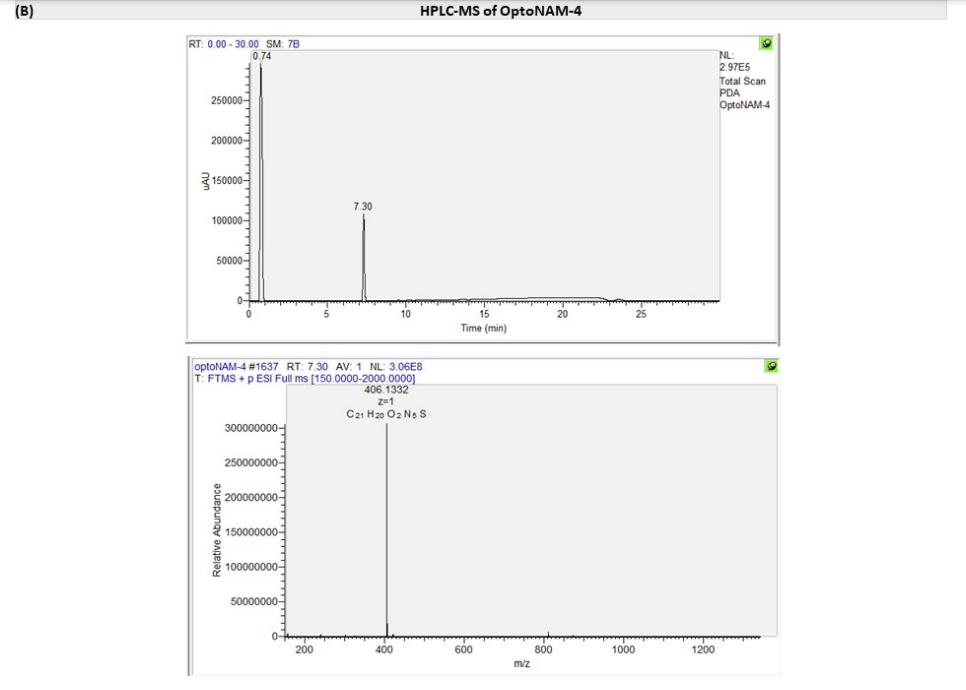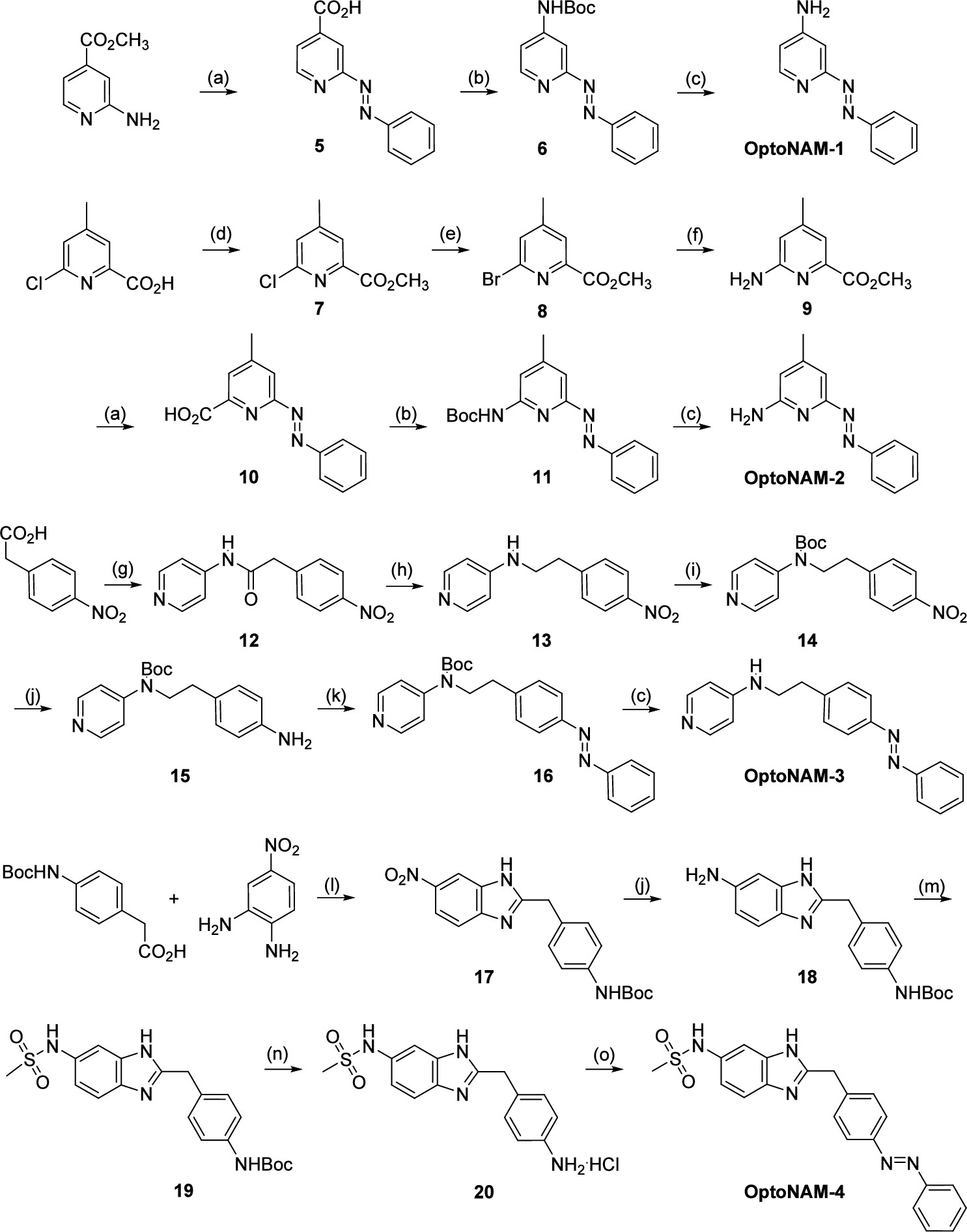 Scheme 1. Synthesis of OptoNAM-1 to OptoNAM-4aa aReagents and conditions: (a) nitrobenzene, 5 M NaOHaq in toluene, 50 °C for 3 h and then 80 °C for 12 h, 72–80%; (b) DPPA, Et3N, tBuOH in toluene, 75 °C for 3 h and then 100 °C for 12 h, 70–75%; (c) 6 M HClaq, MeOH, RT for 16 h, 47–51%; (d) SOCl2, MeOH, reflux for 16 h, 91%; (e) TMSBr, propionitrile, reflux for 4 h, 99%; (f) benzophenone imine, Cs2CO3, toluene, Pd2(dba)3, and BINAP, 90 °C for 12 h, 47%; (g) 4-aminopyridine, DCC, THF, RT for 16 h, 68%; (h) borane dimethyl sulfide, RT for 2 h and then 65 °C for 3 h, 59%; (i) Boc2O, DMAP, THF, 65 °C for 3 h, 100%; (j) 10% Pd/C and H2, RT for 16 h, 100%; (k) nitrobenzene, AcOH, RT for 8 h, 70%; (l) methyl chloroformate, Et3N, DMF, 20 °C for 4 h, 44%; (m) pyridine, CH3SO2Cl, CH2Cl2, RT for 16 h, 95%; (n) MeOH, 4 M HCl in dioxane, RT for 12 h, 100%; (o) KOAc, glacial acetic acid, nitrobenzene, RT for 8 h, 19%. The photochemical and biological characterizations of OptoNAM-1, OptoNAM-2, and OptoNAM-4 are described in Text S1, Figures S1 and S2, and Table S1. In brief, OptoNAM-1 and OptoNAM-2 displayed photodependent activity on GluN1/GluN2B NMDARs but with a > 1000-fold shift in IC50 compared to their parent compounds (Figure S1 and Table S1). This is likely due to the loss of protonation of the aminopyridine moiety at physiological pH induced by the introduction of the azo moiety (Figure S2). Protonation was indeed shown to be critical for the activity of this class of compounds onto GluN1/GluN2B NMDARs (39) (Figure S2G). OptoNAM-4, on the other hand, retained strong potency for GluN1/GluN2B NMDARs, but its activity was not photodependent (Figure S1 and Table S1). In this paper, we focus on OptoNAM-3 (Figures 1 and 2A), which emerged as the best candidate for efficient photocontrol of GluN1/GluN2B NMDARs (see below). |