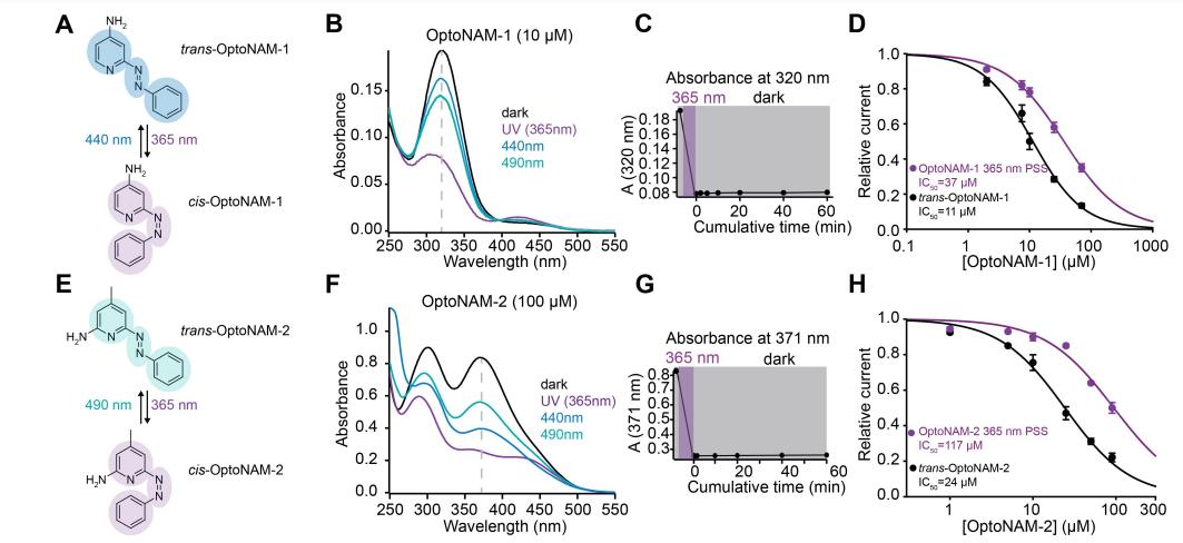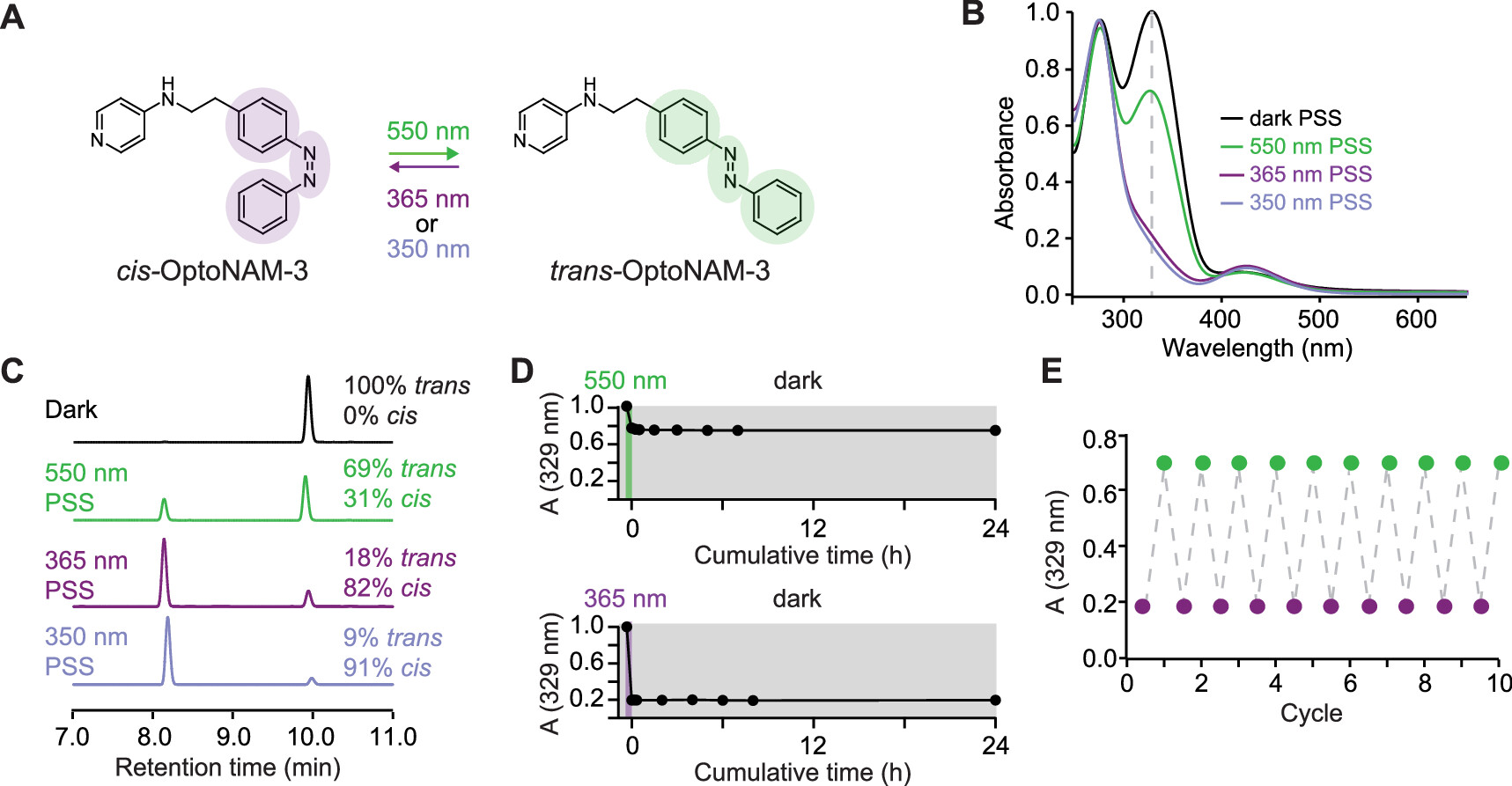 Figure 2. Photochemical properties of OptoNAM-3. (A) OptoNAM-3 can effectively be switched from trans to cis configuration by UV illumination (365 or 350 nm) and back to trans configuration by 550 nm light. (B) UV–visible absorption spectra of OptoNAM-3 in physiological aqueous buffer (Ringer pH 7.3, see Methods) in the dark, after UV illumination by 350 or 365 nm light, and after 550 nm illumination of the 365 nm PSS. The dashed line represents the peak absorption wavelength of trans-OptoNAM-3 (329 nm). (C) HPLC chromatograms of OptoNAM-3 in the dark, after 365 and 350 nm illumination, and after subsequent illumination by 550 nm light. The photostationary states (PSSs) at these different wavelengths were quantified and written next to the peaks corresponding to each isomer. (D) OptoNAM-3 550 and 365 nm PSS displays strong thermal stability in the dark in physiological aqueous buffer (Ringer pH 7.3, see Methods) and at room temperature: no change of their absorption spectrum was observed up to 24 h after illumination. (E) OptoNAM-3 can undergo 10 cycles of UV/green illumination without degradation. The graph represents the absorbance at 329 nm for each light condition (purple circle solids for OptoNAM-3 365 nm PSS and green circle solids for 550 nm). |