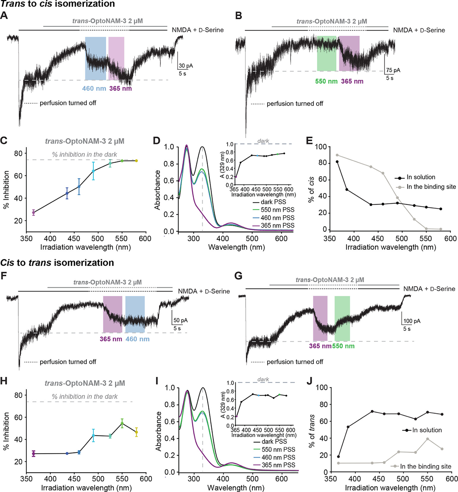 Figure 5. Binding of OptoNAM-3 onto GluN1/GluN2B NMDARs changes its photochemical properties. (A–E) Spectral dependence of trans-to-cis isomerization (A, B) Current traces from DIV 6–8 cultured cortical neurons following application of NMDA (300 μM) and d-serine (50 μM), as well as 2 μM OptoNAM-3. As described in Figure 4, once steady-state inhibition by trans-OptoNAM-3 was reached, the patched cell and the surrounding extracellular medium were illuminated by various wavelengths: in our example, 460 nm (blue bar) in Figure 5A and 550 nm (green bar) in Figure 5B followed by 365 nm (violet bar) as a control for the lowest amount of inhibition. (C) Percentage of inhibition by 2 μM OptoNAM-3 upon irradiation with different wavelengths on the cell. 365 nm was the most efficient wavelength allowing reduction of inhibition to 27% ± 2%. n = 23 for 365 nm; n = 4 for 435 nm; n = 5 for 490 and 550 nm; and n = 6 for 460 and 525 nm. Data points from 435 to 580 nm represented in this figure were scaled between 365 nm and dark condition for better accuracy (see Methods for the calculation protocol). (D) UV–visible spectra of a solution of OptoNAM-3 in the dark (black curve) and after illumination with 365, 460, or 550 nm (violet, blue, and green curves, respectively, extracted from Figure S1M). Inset: absorbance at the peak absorbance wavelength of the dark state (329 nm) of OptoNAM-3 following illumination at various wavelengths of the dark PSS. Note that in solution, the 460 and 550 nm PSS are similar. (E) Proportion of the cis isomer in OptoNAM-3 PSS for different illumination wavelengths in solution (calculated from the UV–visible spectra as in Figure 5D, black points) or in a cellular context (cAM-3 inhibition under various wavelengths as shown in Figure 5A–C, gray points, see Methods). This graph reveals a red shifting of OptoNAM-3 spectral properties in a cellular context. (F–J) Spectral dependence of cis-to-trans isomerization. (F,G) Current traces from cortical neurons following application of NMDA (300 μM) and d-serine (50 μM), as well as 2 μM OptoNAM-3. Once steady-state inhibition by trans-OptoNAM-3 was reached (dark), the patched cell and the surrounding extracellular medium were illuminated by 365 nm light to convert OptoNAM-3 to a mostly cis configuration. Then, various wavelengths were applied to convert OptoNAM-3 back to trans: in our examples, 460 nm (blue bar) in Figure 5F and 550 nm (green bar) in Figure 5G. (H) Percentage of inhibition by 2 μM OptoNAM-3 upon irradiation with different wavelengths post 365 nm illumination of the cell. 550 nm is the most efficient wavelength allowing recovery of inhibition to 55% ± 4%. n = 23 for 365 nm; n = 4 for 435, 460, 490, and 525 nm; n = 9 for 550 nm; and n = 5 for 580 nm. Data points from 435 and 580 nm represented in this figure were scaled between 365 nm and dark conditions (see Methods for the calculation protocol). (I) UV–visible spectra of a solution of OptoNAM-3 in the dark (black curve), after 365 nm illumination (violet curve), and subsequent illumination with 460 (blue curve) or 550 nm (green curve) (extracted from Figure S1N). Inset: absorbance at the peak absorbance wavelength of the dark state (329 nm) of OptoNAM-3 following illumination at various wavelengths of the 365 nm PSS. (J) Proportion of the trans isomer in OptoNAM-3 PSS obtained upon irradiation with various wavelengths of the OptoNAM-3 365 nm PSS either in solution or in a cellular context (same calculation methods as in Figure 5E). This graph reveals a red-shifted and less efficient cis-to-trans photoconversion in a cellular context (OptoNAM-3 likely in its binding site) than in solution. |