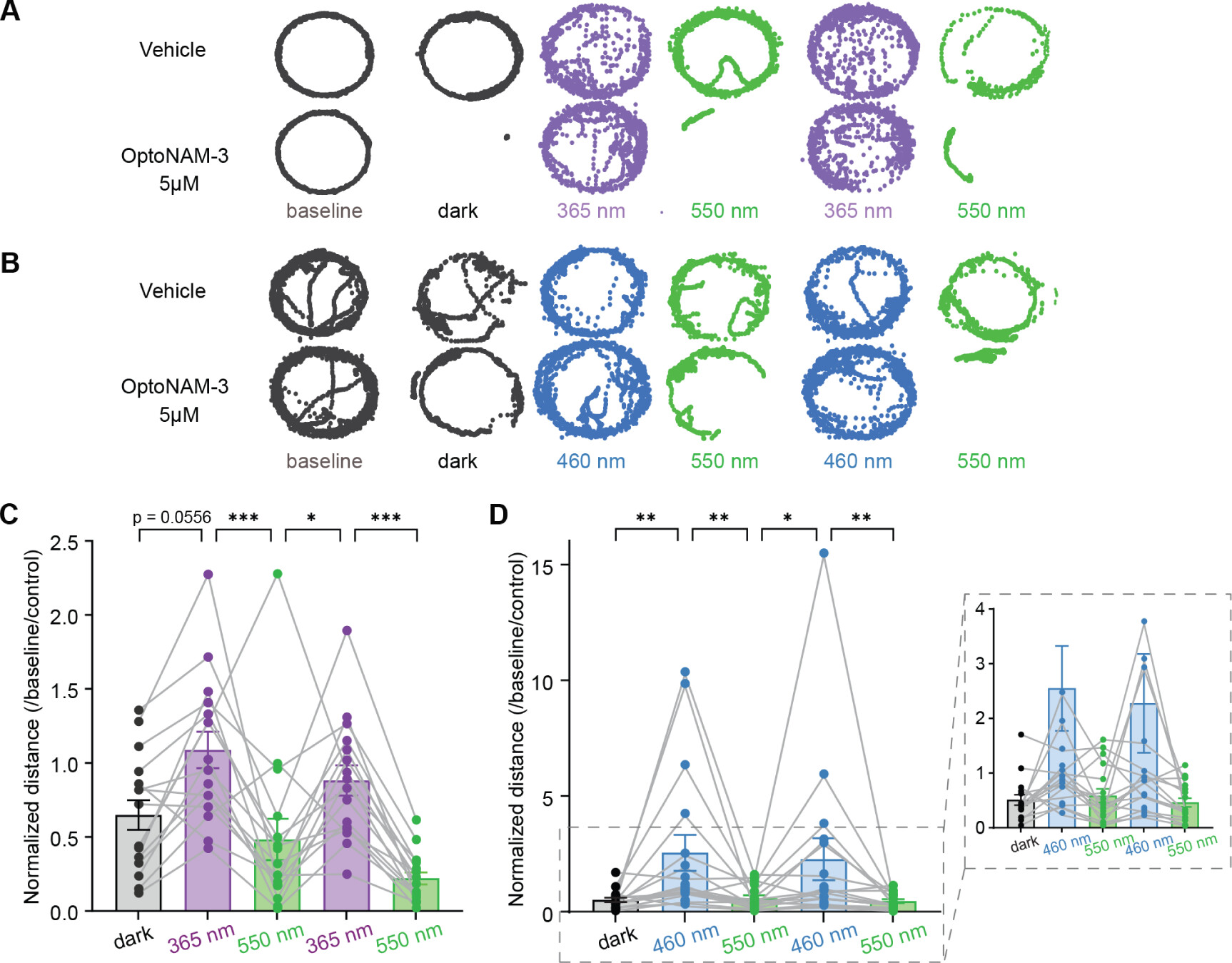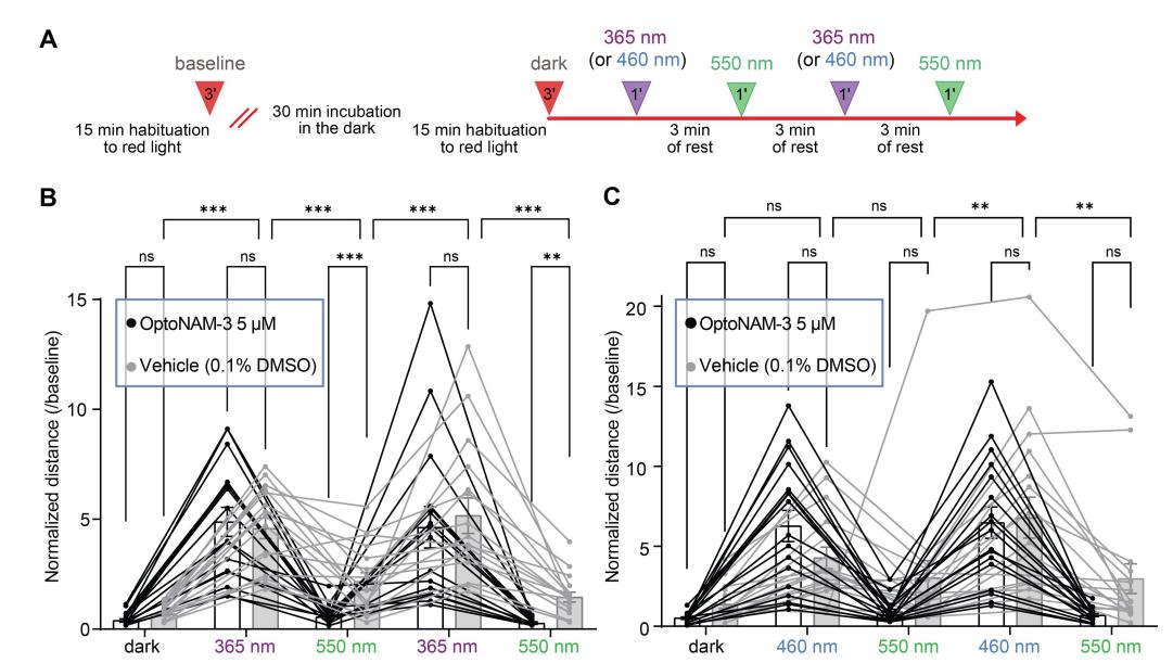 Figure 6. OptoNAM-3 photomodulates Xenopus tadpole locomotion in vivo. (A, B) Positions (represented by dots) of a tadpole’s stomach in a well, taken every 40 ms during 3 min of recording for baseline and dark conditions, and 1 min of recording for either 365 and 550 nm (A), or 460 and 550 nm illumination cycles (B). Top: tadpole incubated in vehicle (0.1% DMSO, control condition). Bottom: tadpole incubated in 5 μM OptoNAM-3. (C, D) Normalized distance (by their baseline locomotion in the dark and the locomotion of the control group in the same light condition, see Methods and Figure S5) traveled by tadpoles (1 point represents the mean traveled distance per well containing 3 tadpoles) exposed to OptoNAM-3 in the dark and during UV/green (C) or blue/green light cycles (D). n = 16 for Figure 6C and n = 17 for Figure 6D; 48 and 51 tadpoles in total, respectively. The means of 3 tadpoles per well were used to perform a paired statistical test. n.s., p > 0.05; ***, p < 0.001; **, p < 0.01; *, p < 0.05; Friedman’s test followed by Dunn’s multiple comparison test. |