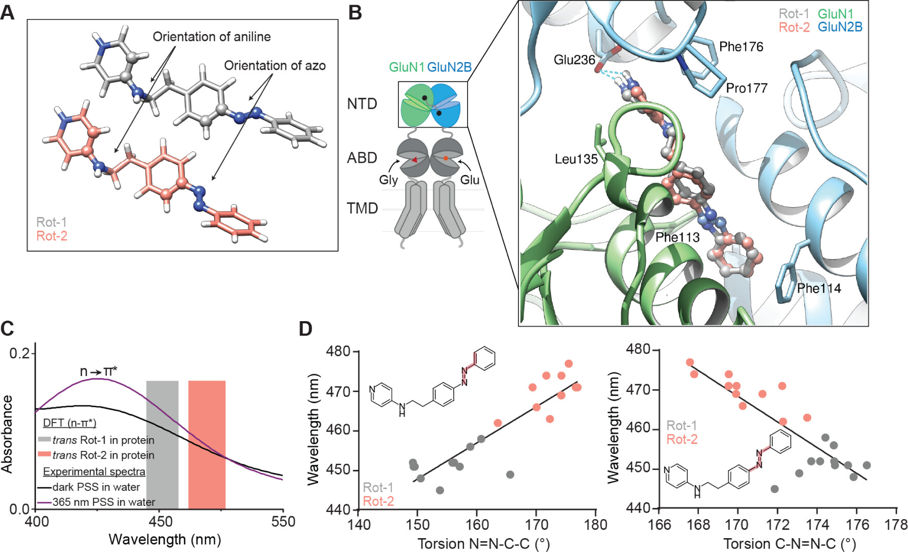 Figure 7. Molecular simulations of OptoNAM-3 in solution and in its binding site. (A) 3D representation of trans-OptoNAM-3 Rot-1 (gray) and Rot-2 (salmon) and definition of the two dihedral angles (displayed as balls and sticks) that were monitored during molecular dynamics simulations. (B) Docking poses of trans-OptoNAM-3 Rot-1 (gray) and Rot-2 (salmon) in their binding site: like ifenprodil, at the interface between GluN1 (green) and GluN2B (blue) NTD upper lobes. Residues important for ifenprodil binding (18−20) are highlighted as sticks. Note that these residues also contact OptoNAM-3 showing a similar binding mode between the two compounds (see also Figure S9A). (C) Superposition of the experimental n → π* band of the UV–vis spectra of OptoNAM-3 dark PSS (dark line) and 365 nm PSS (violet line) in aqueous buffer (Ringer pH 7.3) to the theoretical n → π* transitions of bound trans-OptoNAM-3 Rot-1 and Rot-2 predicted by DFT calculations (gray and salmon bars representing respectively the range of computed wavelengths for trans-OptoNAM-3 Rot-1 and Rot-2 across the different snapshots of the dynamic, see Table S3). (D) Relationships between the N═N─C─C and C─N═N─C torsion angles (as highlighted in pale red in the inset chemical structures) of bound trans-OptoNAM-3 in the 11 snapshots selected for DFT calculations and their computed n → π* absorption wavelengths, for Rot-1 (in gray) and Rot-2 (in salmon). Linear regression: R2 = 0.803 (left) and 0.705 (right). |