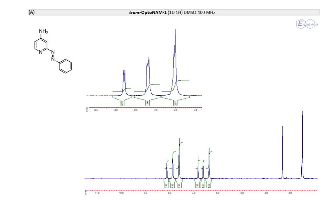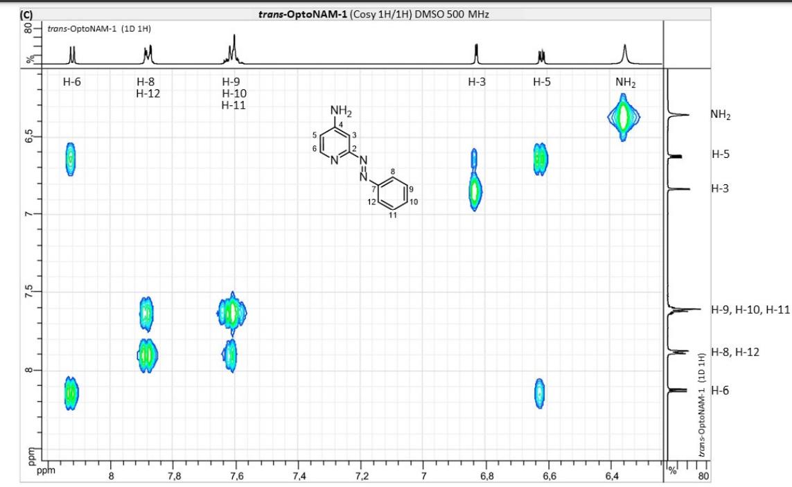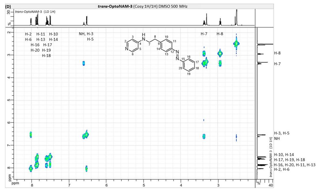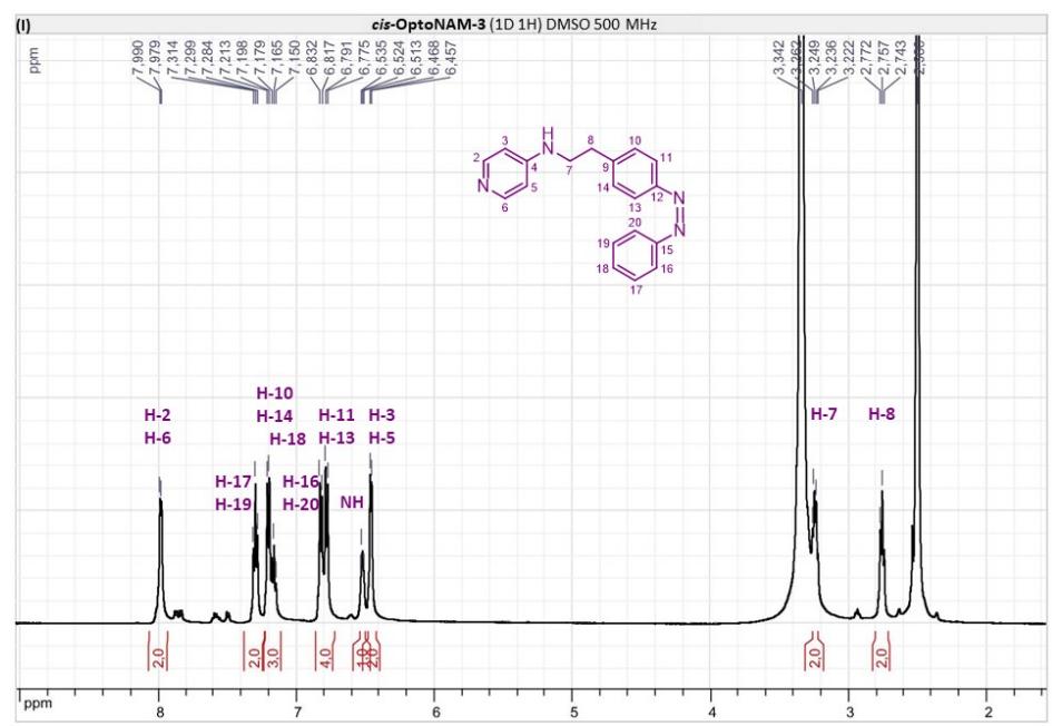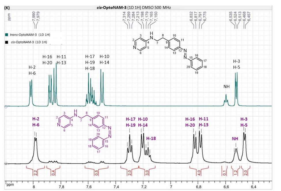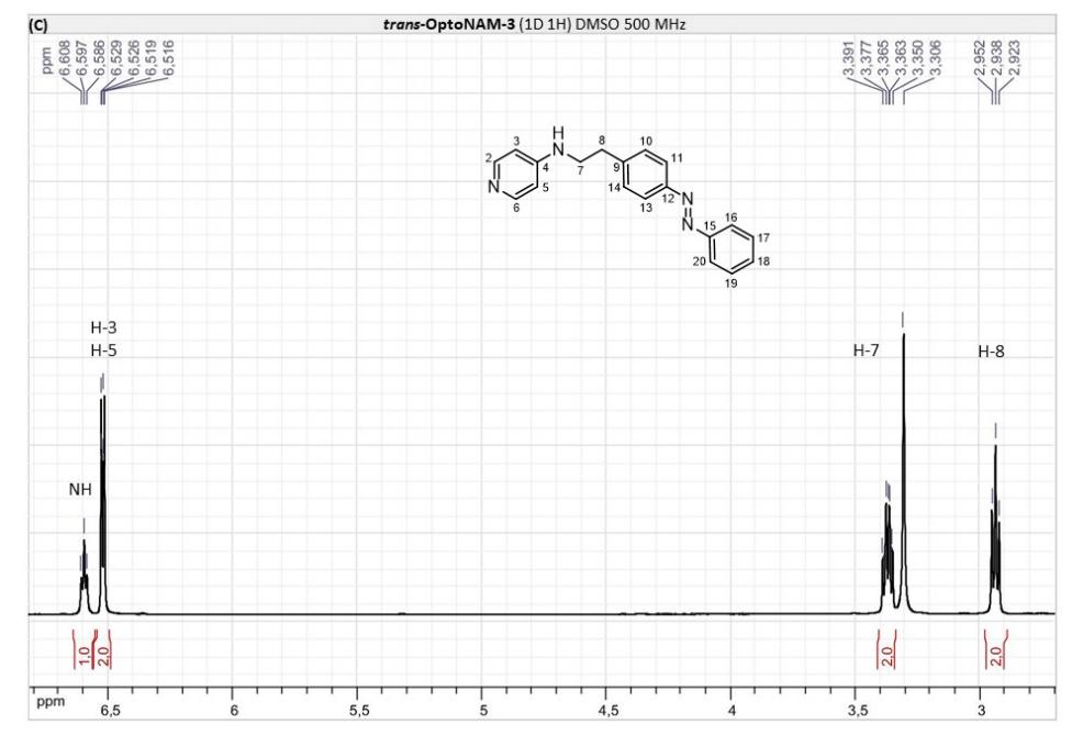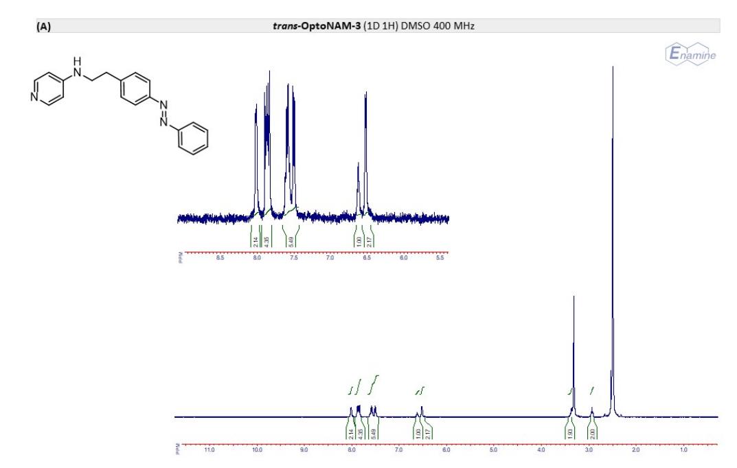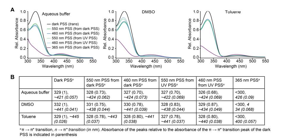 Figure S6. OptoNAM-3 photochemical properties in different solvents. (A) UV-visible absorption spectra of OptoNAM-3 (25 µM) in physiological aqueous solution (Ringer at pH 7.3), DMSO and toluene. Black curves represent the dark PSS, the violet ones OptoNAM-3 365 nm PSS, the blue and green curves represent OptoNAM-3 460 nm and 550 nm PSS obtained after illumination of the dark PSS, and the dotted blue and green curves represent OptoNAM-3 460 nm and 550 nm PSS obtained after illumination of the 365 nm PSS. (B) Maximum absorption wavelengths of the peaks corresponding to the π → π* transition (in regular police) and n → π* transition (in italic) for the different OptoNAM-3 PSS in the different solvents. For each solvent, the absorbance of each peak relative to the absorbance of the π → π* transition peak of the dark PSS is indicated in parenthesis. |