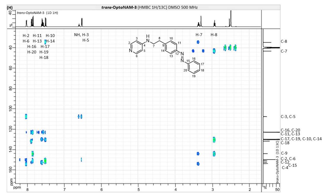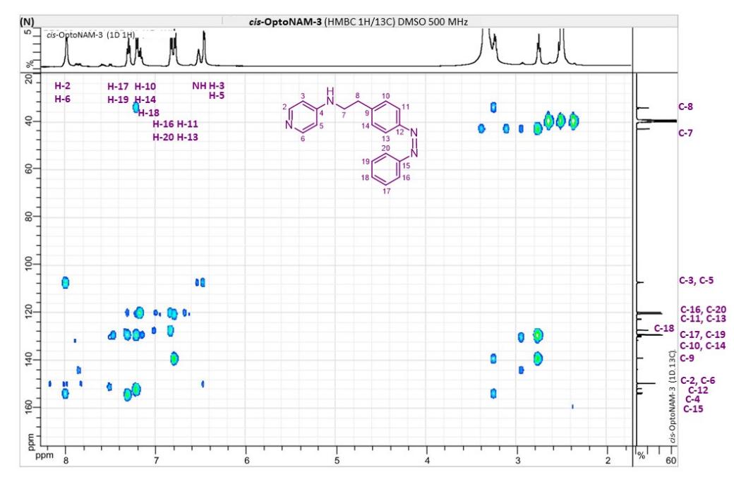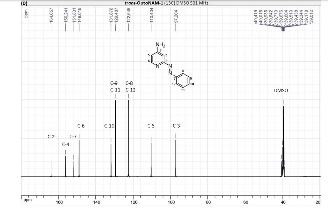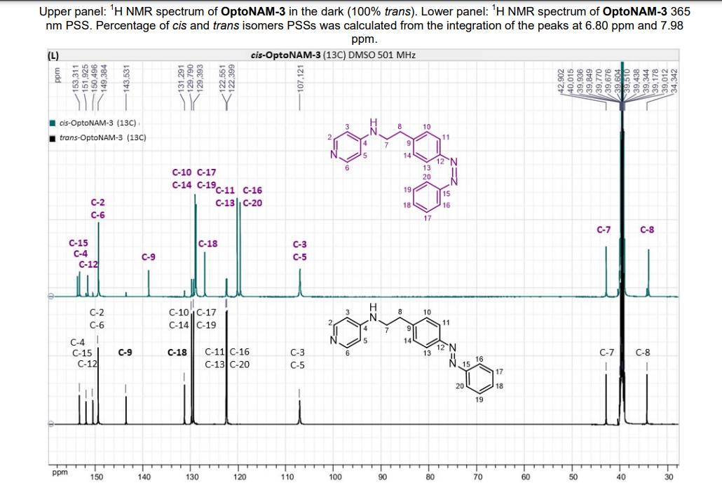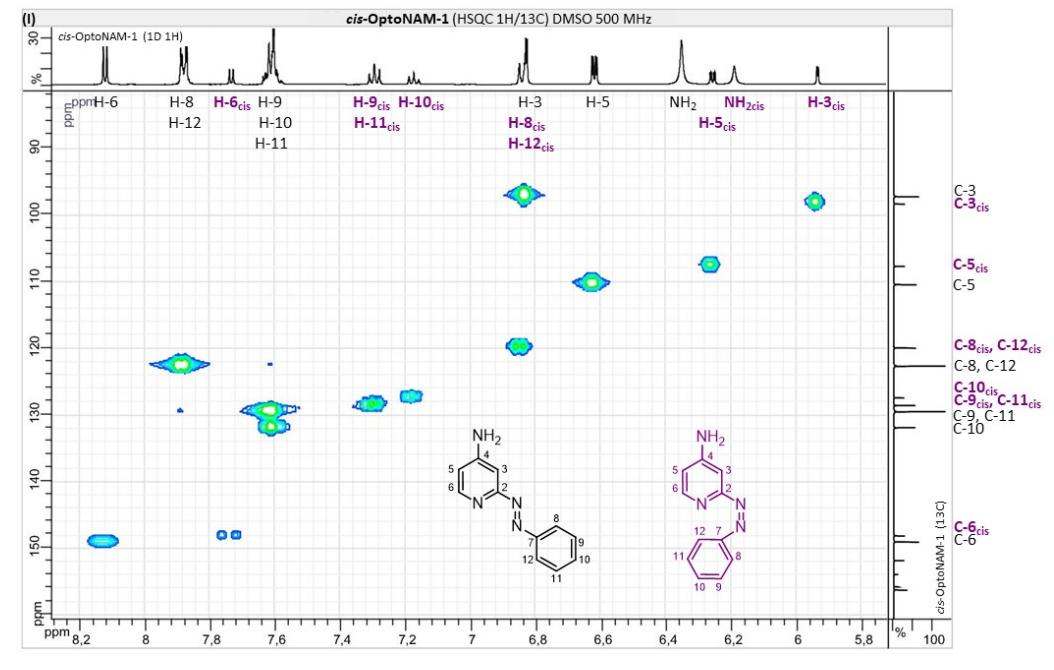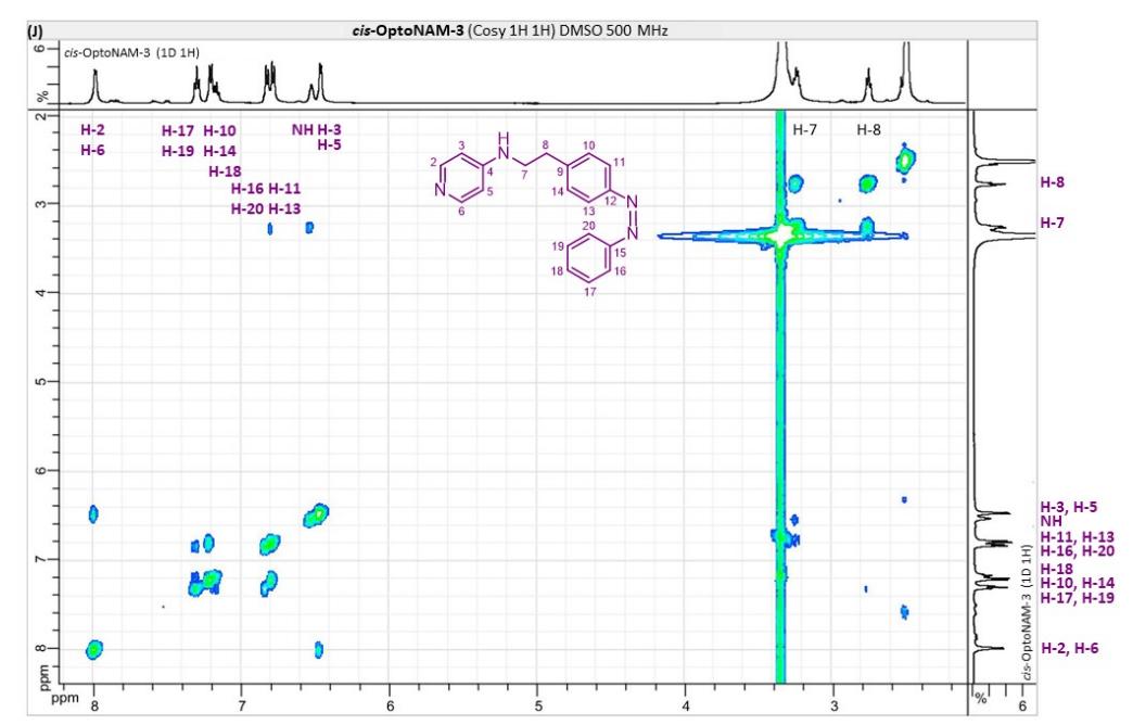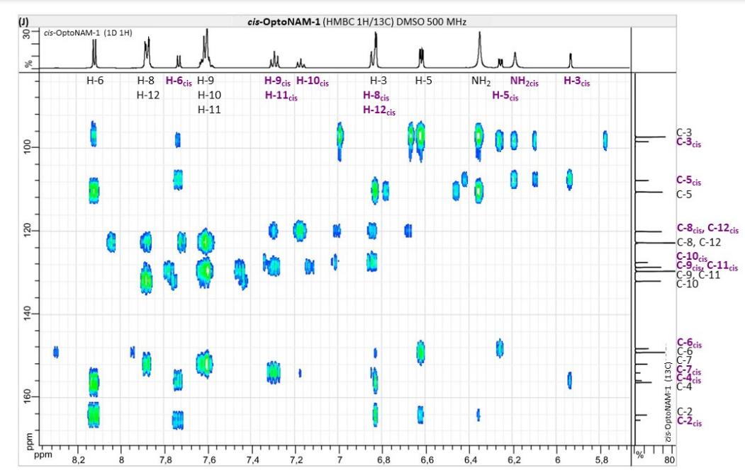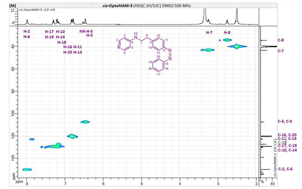 Figure S6. OptoNAM-3 photochemical properties in different solvents. (A) UV-visible absorption spectra of OptoNAM-3 (25 µM) in physiological aqueous solution (Ringer at pH 7.3), DMSO and toluene. Black curves represent the dark PSS, the violet ones OptoNAM-3 365 nm PSS, the blue and green curves represent OptoNAM-3 460 nm and 550 nm PSS obtained after illumination of the dark PSS, and the dotted blue and green curves represent OptoNAM-3 460 nm and 550 nm PSS obtained after illumination of the 365 nm PSS. (B) Maximum absorption wavelengths of the peaks corresponding to the π → π* transition (in regular police) and n → π* transition (in italic) for the different OptoNAM-3 PSS in the different solvents. For each solvent, the absorbance of each peak relative to the absorbance of the π → π* transition peak of the dark PSS is indicated in parenthesis. |