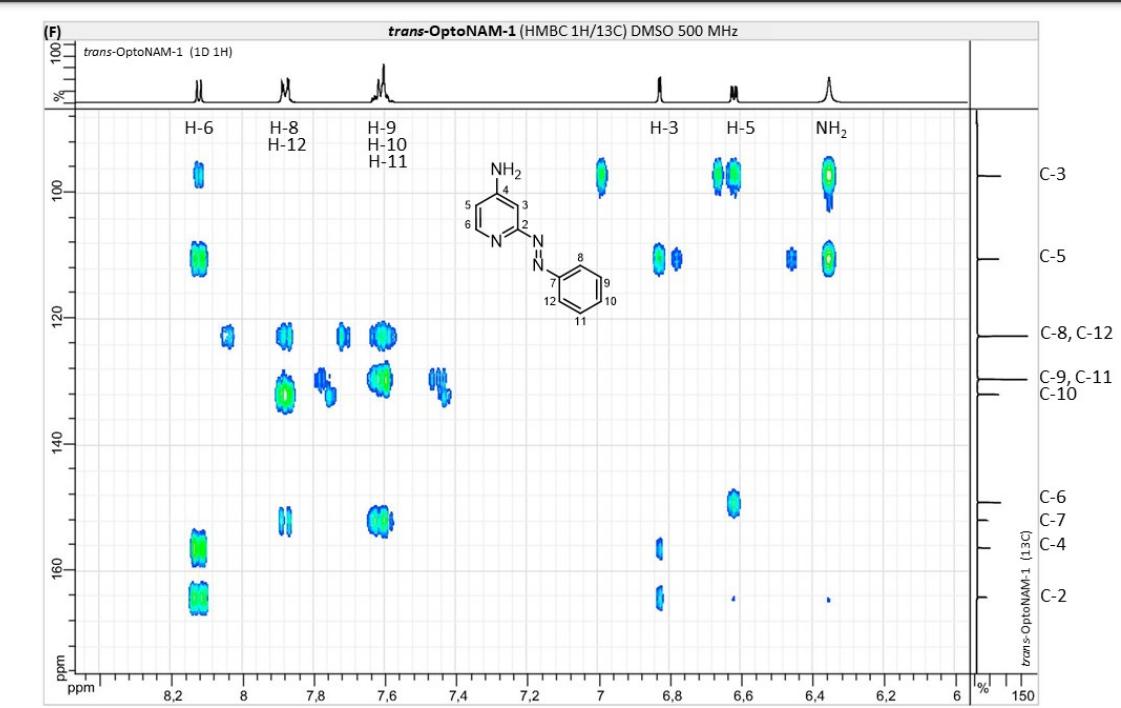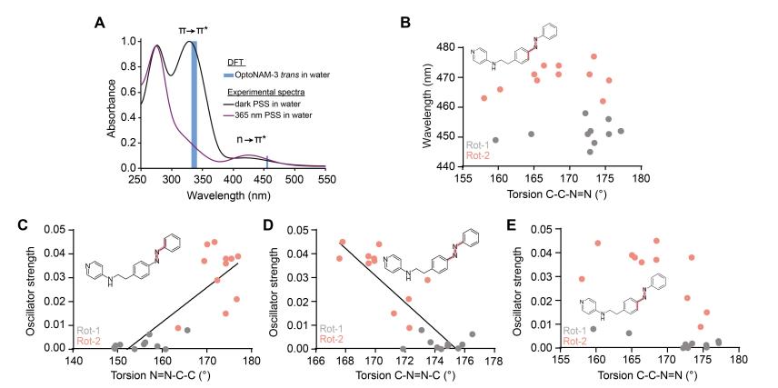 Figure S8. Additional data relative to Figure 7. (A) Superposition of the experimental π → π* and n → π* bands of the UV-Vis spectra of free OptoNAM-3 dark PSS (trans state, dark line) and 365 nm PSS (violet line) in aqueous buffer (Ringer pH 7.3), to the theoretical π → π* and n → π* transitions of OptoNAM-3 in implicit water computed by DFT calculations (blue bars representing the range of computed wavelengths for trans-OptoNAM-3 across the different snapshots of the dynamic, see Table S2). (B) Relationship between the C-C-N=N torsion angle (as highlighted in pale red in the inset chemical structure) of bound trans-OptoNAM-3 in the 11 snapshots selected for DFT calculations and their computed n→π* absorption wavelengths, for Rot-1 (in grey) and Rot2 (in salmon). (C-E) Relationships between the N=N-C-C (C), C-N=N-C (D), and the C-C-N=N (E) torsion angles (as highlighted in pale red in the inset chemical structures) of bound trans-OptoNAM-3 in the 11 snapshots selected for DFT calculations and their predicted oscillator strengths, for Rot-1 (in grey), and Rot2 (in salmon). Linear regressions: R2 = 0.746 (C) and 0.706 (D). |
