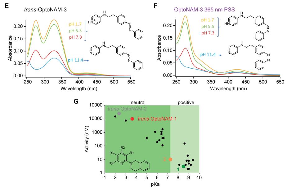Figure S2. Decreased pKa of OptoNAM-1 and -2 compared to their parent compounds are likely responsible for their decreased activity. (A-F) pKa estimation of the trans (A,C,E) and cis (365 nm PSS) (B,D,F) isomers of OptoNAM-1 (A,B), OptoNAM-2 (C,D) and OptoNAM-3 (E,F) by UV-visible spectrum analysis. UV-visible absorption spectra were measured at different pH (1.7 in yellow, 5.5 in green, 7.3 in red and 11.4 in blue). Correspondence between spectra at different pH and OptoNAM protonated and unprotonated chemical structures is indicated. A leftward shift and a decrease of the absorbance peak corresponding to the aminopyridine carrying the charge was observed upon OptoNAM deprotonation. This effect is most obvious for OptoNAM-2 and characteristic of the deprotonated spectra of 2,6-diaminopyridine bases.9 Based on this analysis, at physiological pH, OptoNAM-1 and -2, either in cis or trans, are unprotonated, while OptoNAM-3 is protonated. (G) Relationship between the activity and the measured pKa of compounds from the same chemical series as parent compound 1 (values from ref. 3) (black dots). Parent compound 1 is highlighted as a thick green dot. Parent compound 2 (orange), as well as trans-OptoNAM-1 (red) and -2 (grey) were added to the plot according to their published or measured activity (Supplementary Table 1), and predicted pKa (pKa was predicted by Marvin, Chemaxon https://www.chemaxon.com). “Neutral” (dark green) and “Positive” (light green) indicate whether the compounds of a given pKa are neutral (dark green) or positively charged (light green) at physiological pH (pH = 7.3). Note the tight correlation between pKa and activity, suggesting that the decreased pKa of OptoNAM-1 and -2 induced by azologization of the parent compounds, resulting in a loss of protonation at physiological pH, is responsible for the large decrease of activity of these compounds. |