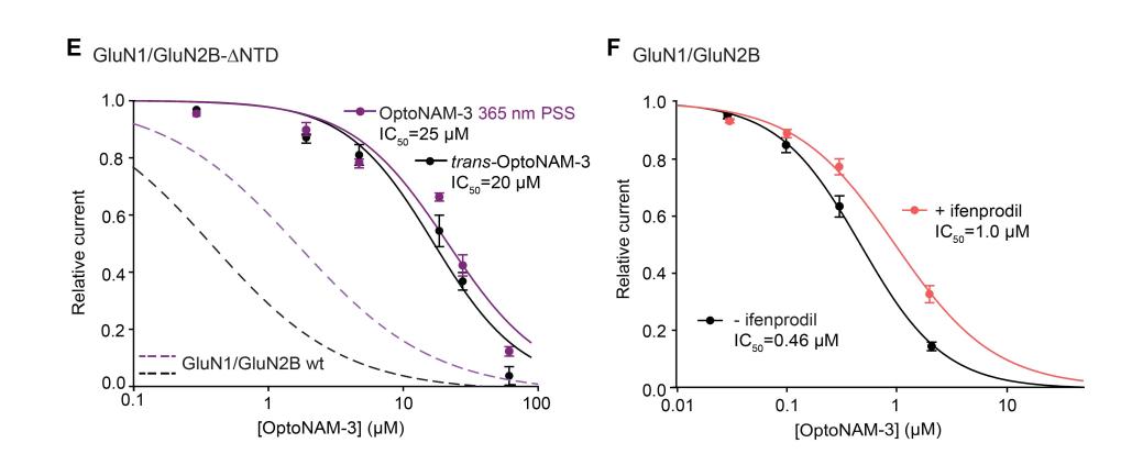 Introduction Neuronal plasticity, the brain’s ability to continually adapt to its environment or experiences, hinges on the dynamics of chemical synapses. At these specialized neuronal sites, neurotransmitters released from a presynaptic neuron cross the synaptic cleft and activate receptors on the postsynaptic neuron, hence mediating the transmission of information from one neuron to another. N-Methyl-d-aspartate receptors (NMDARs) are a class of ionotropic receptors activated by glutamate, the main excitatory neurotransmitter of the vertebrate central nervous system. They play a central role in synaptic transmission and plasticity, but their dysfunction is also involved in many pathologies. (1−3) NMDARs are tetramers composed of two GluN1 and two GluN2 (or GluN3) subunits. Each tetramer can either incorporate two identical GluN2 (or GluN3) subunits (diheteromers) or different GluN2 (or GluN3) subunits (triheteromers), each GluN2 subunit conferring to the receptor distinct biophysical and pharmacological properties, as well as different expression and signaling profiles. (1,2) Understanding the functional role of NMDAR individual subtypes in the brain is fundamental to developing new strategies to counteract the deleterious effects of NMDAR deregulation. Overactivation of NMDARs, as occurring during traumatic brain injury or stroke, induces an excessive increase in intracellular calcium, a process leading to neuronal death (excitotoxicity). (4) This excitotoxicity phenomenon is also observed in neurodegenerative diseases like Alzheimer’s and Parkinson’s diseases. (1,2,5,6) NMDAR overactivation furthermore occurs in other pathologies such as epilepsy, neuropathic pain, and depression. (1,2,5,7) Multiple studies point to a specific role of GluN2B-containing NMDARs (GluN2B-NMDARs) in triggering excitotoxicity, although this role is debated. (1,5,6) To counteract the deleterious effects of GluN2B-NMDAR overactivation, a large number of negative allosteric modulators (NAMs) specific for GluN2B-NMDARs were developed in the late 90s to early 2000s. (5,8−11) These antagonists, of which ifenprodil is the lead compound, (12,13) displayed neuroprotective properties in vitro and in vivo with reduced adverse effects compared to broad spectrum antagonists. (1,5,10,14−16) So far, however, all of these compounds failed in clinical trials because of a lack of effect or a narrow therapeutic window. (5,16,17) Ifenprodil derivatives bind at the level of the NMDAR N-terminal domains (NTDs), (18,19) which are bilobar domains preceding the agonist-binding domain (ABD) and constitute a hub for allosteric modulation in NMDARs (2,3,5,8) (see Figure 3A for the NMDAR subunit architecture). At this level, these compounds induce their inhibition by interacting with the upper lobe of GluN1 NTD and with the upper and lower lobes of GluN2B NTD, (18−20) which favors the entry of NMDARs into an inhibited state. (20−24) Some of these GluN2B-specific NAMs, such as ifenprodil, Ro25–6981, (25) or CP-101606, (26) are currently used as standard pharmacological tools to specifically target GluN2B-NMDARs in native tissues and have proven useful in investigating the contributions of this receptor subtype to several physiological and pathological processes. However, the use of these compounds in native tissues faces serious limitations due to their slow dissociation kinetics. In recombinant systems, time constants of dissociation of GluN2B-specific NAMs are in the tens of seconds to minute time range. (27,28) These slow kinetics are even more marked in native tissues. In brain slices, for instance, relief from inhibition by GluN2B-specific NAMs is so slow that it is considered irreversible. It is thus important to develop GluN2B-selective inhibitors with improved temporal resolution and reversibility of action for a dynamic control of GluN2B-NMDARs in native tissues. Photopharmacology, an approach based on the use of photosensitive ligands, allows such high temporal resolution of action. The most widely adopted method for optical modulation of ion channel activity involves caged compounds, whose activity is inhibited by a photolabile moiety (cage), but this strategy is limited by its irreversibility. (29,30) An alternative approach employs photoconvertible ligands that can alternate between an active and an inactive configuration after exposure to different light wavelengths. (29−31) This photoswitchable property is conferred to the molecule by the presence of a photoisomerisable unit such as an azobenzene, which can reversibly alternate between an extended trans and a twisted cis configuration using two different wavelengths, usually UV and blue–green light. (29−32) In a previous paper, we had developed a caged and a photoswitchable ifenprodil derivative. (33) However, while caged ifenprodil allowed fast GluN2B-NMDAR inhibition upon UV irradiation, the kinetics of NMDAR recovery from inhibition were still limited by the slow dissociation rate of ifenprodil. Additionally, the strategy we used to obtain a photoswitchable ifenprodil – addition of an azobenzene to the ifenprodil molecule (azo-extension approach) (34) – strongly decreased its inhibitory activity, probably because the ifenprodil binding site is too small to accommodate the supplementary azobenzene moiety. (33) In this paper, we took advantage of the chemical diversity of GluN2B-selective antagonists (5,9−11,19,35) and designed photoswitchable NAMs by incorporating the azobenzene moiety within the chemical scaffold of the molecule (azologization approach). (34,36−38) Among the four photoswitchable NAM candidates, OptoNAM-3 appeared as a potent and selective inhibitor of GluN2B-NMDARs in its trans configuration, while its cis isomer was inactive. OptoNAM-3 allowed real-time and reversible control of GluN2B-NMDAR activity with fast (in the second range) temporal resolution. Surprisingly, binding of OptoNAM-3 to GluN2B-NMDARs induced a red-s