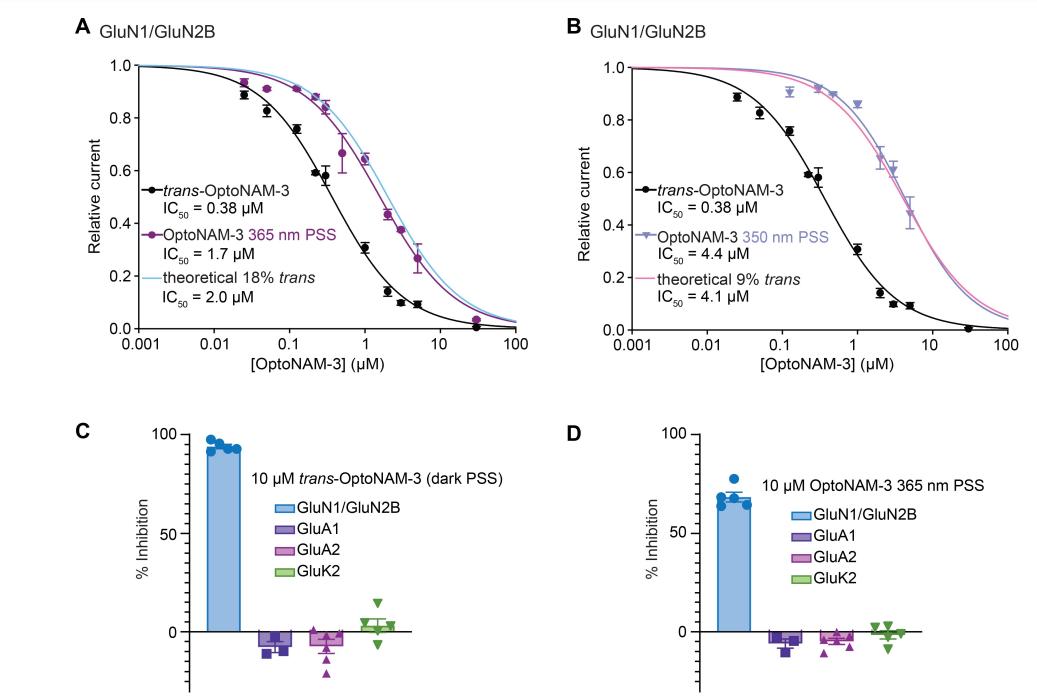 Figure 3. OptoNAM-3 inhibits GluN1/GluN2B selectively and in a photodependent manner. (A) Architecture of a dimer of GluN1 and GluN2B subunits with N-terminal domains (NTDs) in green and blue, respectively. ABD, agonist-binding domain; TMD, transmembrane domain. (B) Representative current traces from oocytes expressing GluN1/GluN2B receptors following application of agonists glutamate and glycine (Glu + Gly, 100 μM each) and 1 μM OptoNAM-3 either in the dark (left), or preilluminated at 365 nm (middle) or 350 nm (right). (C) Dose–response curves of OptoNAM-3 activity on GluN1/GluN2B receptors in the dark (black curve, IC50 = 0.38 ± 0.03 μM, n = 4–21) or preilluminated with 365 nm (violet curve, IC50 = 1.7 ± 0.2 μM, n = 4–17) or 350 nm (lavender curve, IC50 = 4.4 ± 0.6 μM, n = 3–13). Theoretical curves of pure cis-OptoNAM-3 were calculated either from the 365 nm PSS (18% trans/82% cis, violet dotted line) or from the 350 nm PSS (9% trans/91% cis, lavender dotted line). (D) Inhibitions by 1 μM trans-OptoNAM-3 of GluN1/GluN2B, GluN1/GluN2A, GluN1/GluN2C, and GluN1/GluN2D diheteromers, as well as GluN1/GluN2A/GluN2B triheteromers (inhibition: 69% ± 2%, n = 21 for GluN1/GluN2B; 2.7% ± 0.5%, n = 4 for GluN1/GluN2A; 11.4% ± 0.9%, n = 4 for GluN1/GluN2A/GluN2B; 3.2% ± 0.5%, n = 4 for GluN1/GluN2C; and 2.2% ± 0.2%, n = 3 for GluN1/GluN2D). (E) Percentage of inhibition by 1 μM trans-OptoNAM-3 in the dark of wt GluN1/GluN2B receptors (in blue) or of receptors mutated at key residues involved in EVT-101 binding only (GluN1/GluN2B-Q110G, in aquamarine), in ifenprodil binding only (GluN1-L135H/GluN2B, in violet), or on a mutant disrupting binding at both EVT-101 and ifenprodil binding sites (GluN1/GluN2B-ΔNTD, in pink; dotted lines above the bar mean that inhibition was calculated from the dose–response curve in Figure S3E). n.s., p > 0.05; **, p < 0.01; Kruskal–Wallis’ test followed by Dunn’s multiple comparison test. |