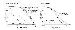 Figure S3. Additional data relative to Figure 3. (A) Inhibition by OptoNAM-3 365 nm PSS is exclusively mediated by the remaining trans isomer still present in solution. (A) Dose-response curves of OptoNAM-3 activity on GluN1/GluN2B in the dark (black curve, IC50 = 0.38 ± 0.03 µM, n = 4-21), pre-illuminated by 365 nm (purple curve, IC50 = 1.7 ± 0.2 µM, n = 4- 17) and theoretical dose-response curve (blue) of a mixture of 18% trans- and 82% cis-OptoNAM-3 (corresponding to the 365 nm PSS determined by HPLC) assuming that only the trans isomer is active. The theoretical curve was calculated from the trans dose-response curve in the dark. The 18% trans theoretical dose-response curve superimposes well to the one of OptoNAM-3 365 nm PSS. (B) Dose-response curves of OptoNAM-3 activity on GluN1/GluN2B in the dark (black curve, IC50 = 0.38 ± 0.03 µM, n = 4-21), preilluminated by 350 nm (lavender curve, IC50 = 4.4 ± 0.6 µM n = 3-13) and theoretical dose-response curve (pink) of a mixture of 9% trans- and 91% cis-OptoNAM-3 (corresponding to the 350 nm PSS determined by HPLC) assuming only the trans isomer is active. The 9% trans theoretical dose response curve is also well superposed to the one of OptoNAM-3 350 nm PSS. This shows that the activity of the 365 nm PSS and 350 nm PSS of OptoNAM-3 can entirely be explained by the amount of remaining trans isomer in the PSS. (C,D) Among iGluRs, OptoNAM-3 is selective for NMDARs. Inhibition by 10 μM trans-OptoNAM-3 (dark PSS, C) and OptoNAM-3 365 nm PSS (D) of agonist-induced currents (glutamate and glycine, 100 μM each) carried by GluN1/GluN2B NMDARs, GluA1 and GluA2 AMPA receptors, and GluK2 kainate receptors. Oocytes expressing GluK2 receptors were treated with concanavalin A (2 mM) before recording to decrease receptor desensitization. (C) Trans-OptoNAM-3 inhibitions: 94 ± 1%, n = 5 for GluN1/GluN2B; -7.4 ± 2.7%, n = 3 for GluA1; -7.4 ± 3.5%, n = 6 for GluA2, 3.1 ± 3.4%, n = 5 for GluK2. (D) Cis-OptoNAM-3 inhibitions: 68 ± 6%, n = 5 for GluN1/GluN2B, -6.0 ± 2.3%, n = 3 for GluA1, -4.9 ± 1.5%, n = 6 for GluA2, -1.5 ± 2.1%, n = 5 for GluK2. (E,F) OptoNAM-3 binds at the ifenprodil binding site. (E) Dose-response curves of OptoNAM-3 on GluN1/GluN2B-∆NTD receptors in the dark (black curve, IC50 = 20 ± 4 µM, n = 3-5) or pre-illuminated with 365 nm (violet curve, IC50 = 25 ± 6 µM, n = 3-5). OptoNAM-3 dose-response curves on wild type GluN1/GluN2B receptors are shown as dashed curves (black and violet for the dark and 365 nm PSS conditions, respectively). The remaining, low affinity inhibition of OptoNAM-3 on GluN1/GluN2B-∆NTD receptors is likely due to a non-selective pore block of NMDARs at negative holding potentials, as previously shown for ifenprodil.10,11 (F) Dose-response curves of trans-OptoNAM-3 in the dark in absence (black curve, IC50 = 0.46 ± 0.06 µM, n = 4) and in presence of 0.2 µM ifenprodil (a concentration close to ifenprodil IC50, orange curve). Ifenprodil increases OptoNAM-3 IC50 by ~2-fold (IC50 = 1.0 ± 0.1 µM, n = 5 in presence of 0.2 µM ifenprodil), which is consistent with a competitive interaction between these two compounds. |