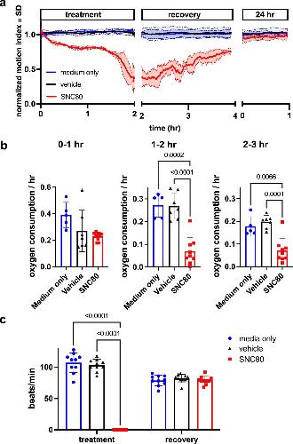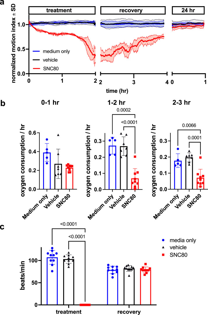 Figure 1. SNC80 treatment in Xenopus tadpoles.(a) Swimming activity of Xenopus during 100 μM SNC80 or vehicle treatment. Data represent the mean ± SD of n=3 replicates, with 10 tadpoles per replicate. (b) Oxygen consumption rate for Xenopus treated with SNC80 or vehicle controls. N=5 medium only, n=7 vehicle and n=9 SNC80, with each data point representing the cumulative oxygen consumption for 5 tadpoles. (c) Heart rate in SNC80 and vehicle-treated Xenopus (n=10 tadpoles/group). Statistical comparisons were performed using a Brown-Forsythe and Welch’s ANOVA test with a Dunnett correction for multiple comparisons (b) and a two-way ANOVA (treatment × timepoint) with Tukey correction for multiple comparisons (c). Bar plots show the mean ± SD of each group. |