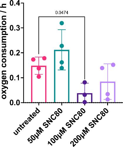 Figure 1—figure supplement 1 Metabolic measurements in SNC80-treated Xenopus embryos. Oxygen consumption rate in Xenopus embryos treated with SNC80 (n=3–4 biological replicates/group). Statistical comparisons were performed using a Brown-Forsythe and Welch’s ANOVA test with Dunnett correction for multiple comparisons between untreated and each treatment group. Data represent the mean ± SD. |