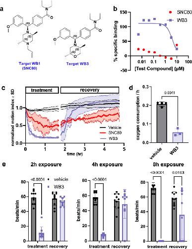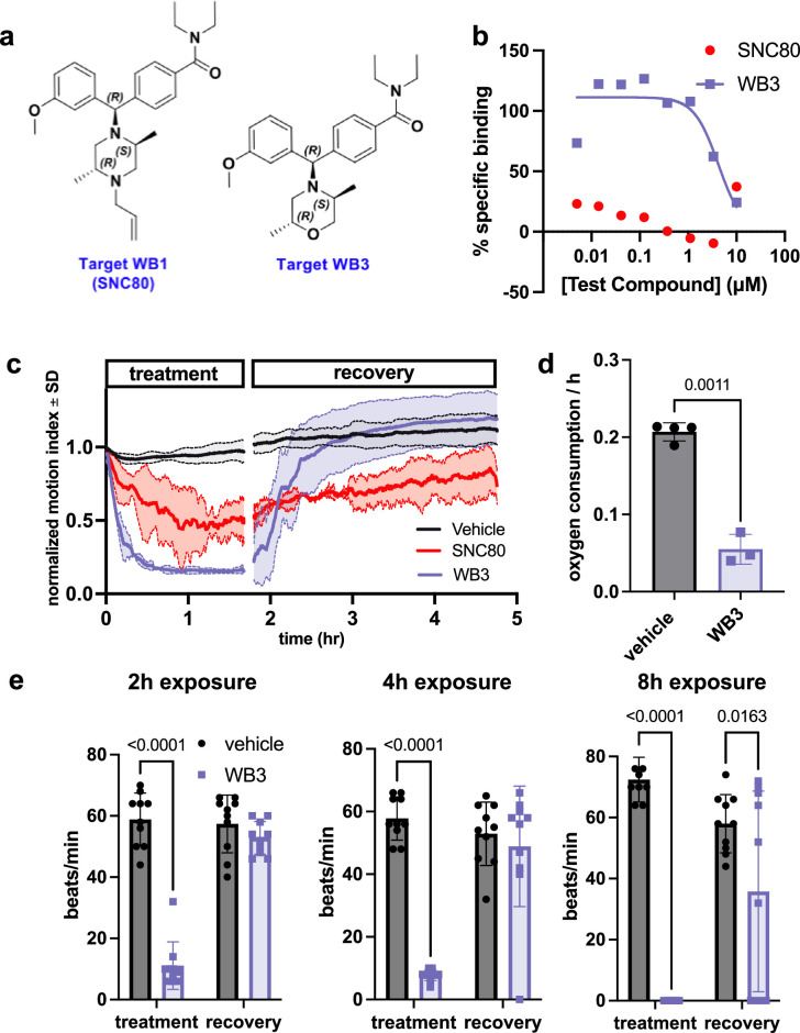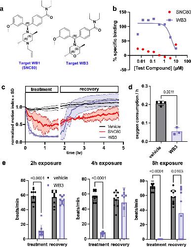 Figure 3 Design and in vivo screening of novel analog WB3. (a) Molecular structures for SNC80 and novel compound WB3. (b) Percent-specific binding of the delta opioid receptor radioligand [3H]-DADLE in the presence of SNC80 and WB3. (c) Swimming activity of Xenopus during 100 μM WB3, SNC80, or vehicle treatment. Data represent the mean ± SD of n=2 replicates, with 10 tadpoles per replicate. (d) Oxygen consumption rate for Xenopus treated with WB3 or vehicle controls. N=4 vehicle and n=3 WB3, with each data point representing the cumulative oxygen consumption for 5 tadpoles. (e) Heart rate in WB3 and vehicle-treated Xenopus (n=10 tadpoles/group). Statistical comparisons were performed using Welch’s unpaired t-test (d) and a two-way ANOVA (group × timepoint) with Sidak’s correction for multiple comparisons (e). Bar plots show the mean ± SD of each group. |