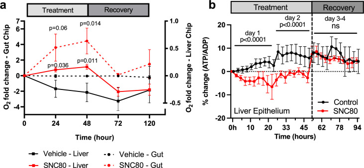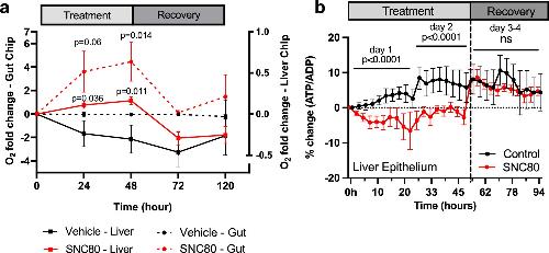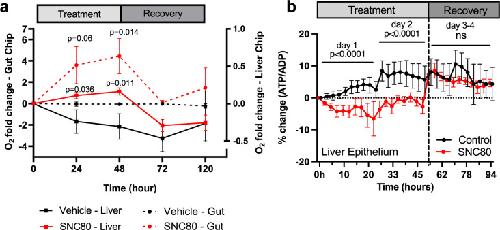 Figure 5. SNC80 treatment in human Organ Chips.(a) Monitoring changes in O2 levels in human Gut (dotted lines; n=6 Chips/group) or Liver (straight lines; n=15–16 Chips/group) Chips throughout the treatment with 100 µM SNC80 (0–48 hr) and recovery (48–120 hr) versus vehicle control chip. (b) Graph showing the quantitative drop in ATP/ADP ratio of Liver Chip treated for 48 hr with 100 μM SNC80 or vehicle control as well as 2 days recovery after drug washout (n=5 control and n=3 SNC80 Chips). Statistical comparisons were performed using multiple unpaired t-tests for each timestamp with multiple comparison between control and treated cells. Data represent the mean ± SD. |