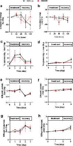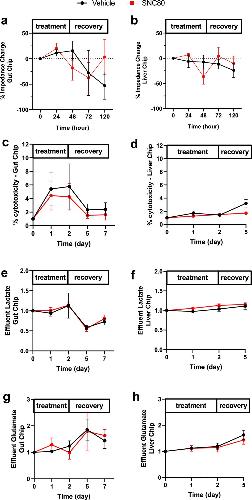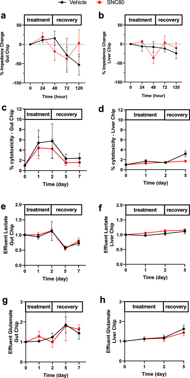 Figure 5—figure supplement 4. Metabolic measurements of Gut and Liver Chip systems treated with SNC80.(a) Monitoring the percentage change in barrier function of Gut (n=6 Chips/group) or (b) Liver Chip (n=9 Chips/group) with time during treatment with 100 µM SNC80 (0–48 hr) and recovery (48–120 hr) versus vehicle control chip. (c) Cytotoxicity measured for the Gut (n=5-6 Chips/group) and (d) Liver Chips (n=7 Chips/group) during treatment and recovery. (e) Graph depicting the amount of lactate measured in effluents of Gut (n=5-6 Chips/group) and (f) Liver Chips (n=7 Chips/group), relative to baseline levels (to day 7 for Gut and day 5 for Liver) for SNC80-treated (red) or vehicle control (black) Chips. (g) Graph showing the glutamate measured in effluents of Gut (n=5 Chips/group) or (h) Liver Chips (n=7 Chips/group) during SNC80 (red) or vehicle (black) treatment and post-recovery (day 7), relative to baseline levels. For each measurement, statistical comparisons were performed using multiple unpaired t-tests at each timepoint and FDR correction for multiple comparisons. Data represent the mean ± SD. |