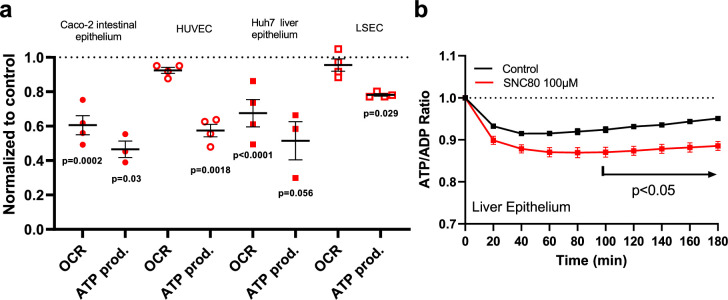 Figure 5—figure supplement 1 SNC80 treatment in cell culture and Organ Chip systems. (a) Oxygen consumption rate (OCR) and mitochondrial ATP production obtained with Seahorse measurements for Caco-2 intestinal epithelium (filled circle), human umbilical vein endothelial cell (HUVEC) (empty circles), Huh7 liver epithelium (filled squares), and liver sinusoidal endothelial cell (LSEC) (empty squares) after 2 hr 100 μM SNC80 treatment (n=3–4 biological replicates/cell type). Values are normalized to their respective vehicle controls. (b) Graph showing the quantitative drop in ATP/ADP ratio of Huh7 cells treated with 100 μM SNC80 (n=2 control and n=3 SNC80 biological replicates). Statistical comparisons were performed using a two-way ANOVA with Dunnett correction with multiple comparison control versus treatment for each dataset. Data represent the mean ± SD. |