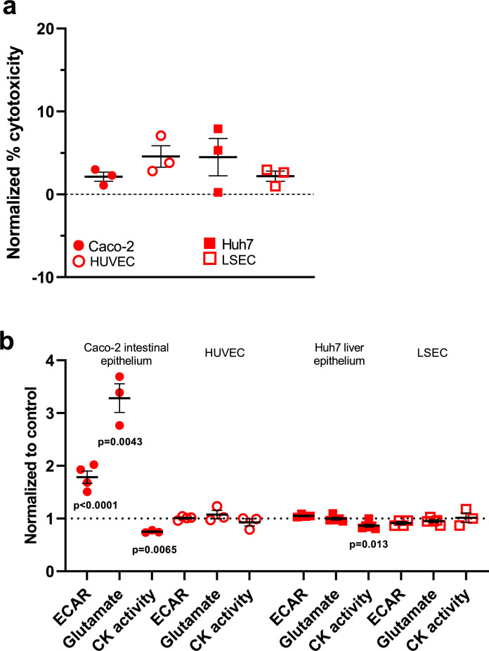 Figure 5—figure supplement 2. Metabolic measurements in gut and liver cultures treated with SNC80.(a) Normalized percent cytotoxicity for Caco-2 intestinal epithelial cells (filled circles) or human umbilical vein endothelial cells (HUVECs) (empty circles) as well as Huh7 liver epithelium (filled squares) or liver sinusoidal endothelial cells (LSECs) (empty squares) after 2 hr of exposure to 100 μM SNC80 (n=3 biological replicates/cell type). (b) Normalized extracellular acidification rate (ECAR), glutamate, and creatine kinase (CK) activity for Caco-2 intestinal epithelial cells (filled circles) and HUVECs (empty circles) as well as Huh7 liver epithelium (filled squares) and LSECs (empty squares) (n=3–6 biological replicates/measurement/cell type). Statistical comparisons were performed using a two-way ANOVA with Dunnett correction with multiple comparison control versus treatment for each dataset (a,b). Data represent the mean ± SD. |