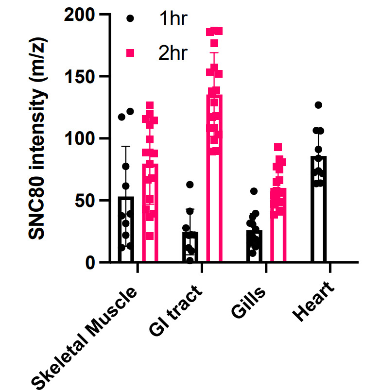 Figure 2. SNC80 uptake and activity at the delta opioid receptor.(a) Distribution of SNC80 in Xenopus tadpoles after 1 and 2 hr of compound exposure. (b) Uptake of SNC80 in the tadpole skeletal muscle, gastrointestinal (GI) tract, and gills at 1 and 2 hr of exposure. (c) Levels of acylcarnitine and cholesterol ester in the skeletal muscle, brain, and cardiac tissue after 1 hr of SNC80 treatment. In vivo distributions of SNC80 and lipid levels measured from N=5 tadpoles per condition; N=3 sections/slide. (d) Oxygen consumption in Xenopus tadpoles treated with SNC80, the delta opioid antagonist naltrindole, or a combination of SNC80 and naltrindole. N=3 replicates/group with each data point representing the cumulative oxygen consumption from 5 tadpoles. Statistical comparisons were performed using a two-way ANOVA (time × tissue region) with Sidak’s correction for multiple comparisons (b), multiple unpaired t-tests for each tissue region with FDR correction (c), and a Welch’s ANOVA test with Dunnett correction for multiple comparisons between vehicle and each treatment group (d). Bar plots show the mean ± SD of each group. |