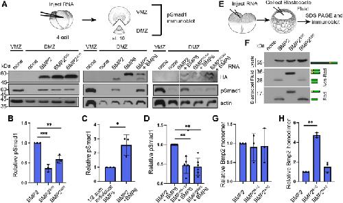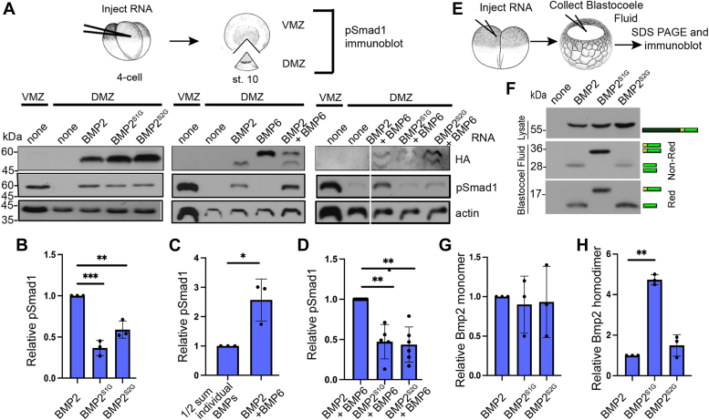 Figure 2. Cleavage of both sites of BMP2 is required to generate fully active BMP2 homodimers and BMP2/6 heterodimers in Xenopus embryos.A–D, RNA encoding wild-type or cleavage mutant forms of HA epitope tagged BMP2 alone or together with HA epitope tagged BMP6 was injected near the dorsal midline of four-cell Xenopus embryos. Ventral (VMZ) and dorsal marginal zone (DMZ) explants were collected at stage 10 and pSmad1 levels were analyzed by immunoblot as illustrated. Representative pSmad1 immunoblots in embryos expressing homodimeric (left panel) or heterodimeric (middle and right panel) ligands are shown (A). The relative level of pSmad1, normalized to actin and HA reported relative to that in embryos expressing wild type BMP2 alone (B), the sum of pSmad1 in embryos expressing individual BMP2 and BMP6 divided by 2 (to normalize RNA levels) (C) or wild type BMP2 together with BMP6 (D) is shown. Data are from three independent experiments (mean ± SD) (∗p < 0.05, ∗∗p < 0.01, ∗∗∗p < 0.001 as determined by unpaired t test). (E–H) Two-cell Xenopus embryos were injected with RNA encoding wild-type or cleavage mutant forms of BMP2. Proteins secreted into the blastocoele cavity were extracted from gastrula stage embryos and deglycosylated with PNGaseF. Immunoblots of proteins separated under reducing (Red) or non-reducing (Non-Red) conditions were probed with antibodies specific for the HA epitope in the ligand domain as illustrated (E). Representative immunoblots are shown with bands corresponding to precursor proteins, ligand dimer and monomer indicated to the right of the gel (F). Relative levels of BMP2 monomeric (G) and dimeric (H) ligand reported relative to those in embryos expressing wild type BMP2 is shown. Data are from three independent experiments (mean ± SD) (∗∗p < 0.01 as determined by unpaired t test).