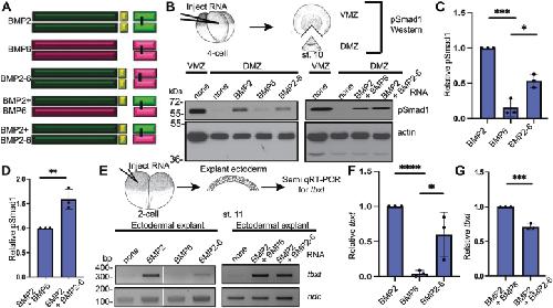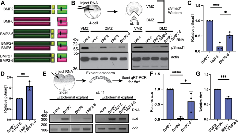 Figure 4. The prodomain of BMP2 is sufficient to generate active BMP6 homodimers and BMP2/6 heterodimers in Xenopus. (A) Schematic illustration of homodimeric and heterodimeric ligands generated from native BMP2 and BMP6 and chimeric BMP2-6 precursor proteins. (B) BMP RNAs were injected individually or together near the dorsal midline of four-cell embryos. VMZ and DMZ explants were collected at stage 10 and pSmad1 levels were analyzed by immunoblot. Representative pSmad1 immunoblots in embryos expressing homodimeric (left panel) and heterodimeric (right panel) ligands are shown. Actin levels were analyzed in duplicate samples as a loading control. (C-D) The relative level of pSmad1, normalized to actin and reported relative to that in embryos expressing native BMP2 alone (C) or together with native BMP6 (D) is shown. Data are from three independent experiments (mean ± SD) (∗p < 0.05, ∗∗p < 0.01, ∗∗∗p < 0.001 as determined by unpaired t test). (E) BMP RNAs were injected alone or together into one animal pole blastomere of 2-cell Xenopus embryos. Ectoderm was explanted at stage 11 and expression of tbxt was analyzed by semi qRT-PCR in embryos expressing homodimeric (left panel) or heterodimeric (right panel) ligands. All lanes from the same experiment, aligned following removal of an intervening lane (marked by white bar) using photoshop. (F-G) The relative level of tbxt normalized to odc and reported relative to that in embryos expressing native BMP2 alone (F) or together with native BMP6 (G) is shown. Data are from three independent experiments (mean ± SD) (∗p < 0.05, ∗∗∗p < 0.001, ∗∗∗∗p < 0.0001 as determined by unpaired t test).