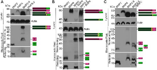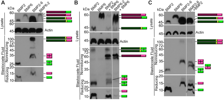 Figure 6. The BMP2 prodomain facilitates dimerization and cleavage of the BMP6 precursor protein in Xenopus. (A-C) Xenopus embryos were injected with RNA encoding native or chimeric forms of BMPs alone to generate homodimers (A) or in the indicated combinations to generate heterodimers (B, C). Proteins secreted into the blastocoele cavity were extracted from gastrula stage embryos and deglycosylated with PNGaseF. Immunoblots of proteins separated under reducing or non-reducing conditions were probed with antibodies specific for the HA epitope in the ligand domain. Representative immunoblots are shown with bands corresponding to precursor protein or ligand monomers or dimers indicated to the right of each gel. All lanes are from the same experiment, aligned following removal of an intervening lane (marked by white bar in B and C) using photoshop. Results were reproduced in at least three independent experiments.