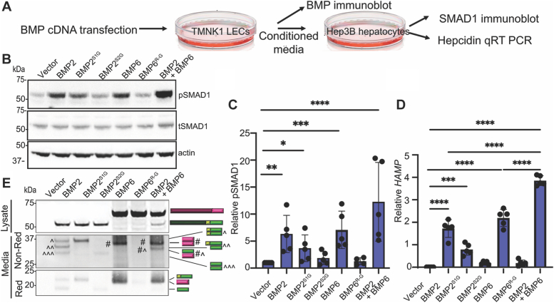 Figure 3. Cleavage of both sites of BMP2 is required to generate fully active BMP2 homodimers in TMNK1 liver endothelial cells. (A-E) TMNK1 cells were transfected with cDNAs encoding wild type or cleavage mutant BMP2 or BMP6 precursors or wild type BMP2 together with BMP6. BMP levels were analyzed 24 h later by probing immunoblots of cell lysates and conditioned media with antibodies specific for the HA tag in each ligand. Conditioned media was applied to Hep3B cells for 6 h, after which cell lysates and RNA were collected, pSMAD1 levels were analyzed by immunoblot, and HAMP levels were analyzed by qPCR as illustrated (A). Representative pSMAD1 immunoblot (B). The relative level of pSMAD1 normalized to actin (C) or HAMP normalized to RPL19 (D) and reported relative to that in cells transfected with empty vector is shown. Data are from a minimum of four independent experiments (mean ± SD) (∗p < 0.05, ∗∗p < 0.01, ∗∗∗p < 0.001, ∗∗∗∗p < 0.0001as determined by ANOVA with Tukey post hoc test). Immunoblots of transfected TMNK1 cell lysates under reducing conditions and media under reducing (Red) or non-reducing (Non-Red) conditions probed with antibodies specific for the HA epitope in the ligand domain. Bands corresponding to precursor proteins, ligand dimers and monomers illustrated to the right of the gel (E).