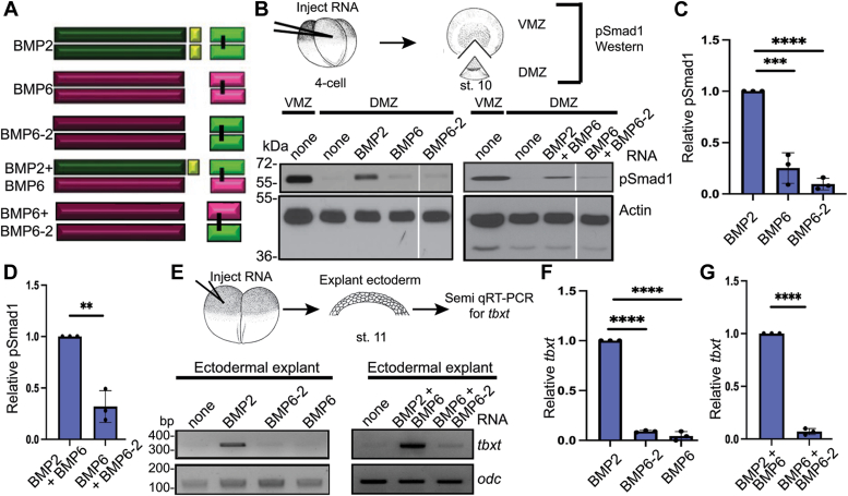 Figure 5. The prodomain of BMP6 is not sufficient to generate active BMP2 homodimers or BMP2/6 heterodimers in Xenopus. (A) Schematic illustration of homodimeric and heterodimeric ligands generated from native BMP2 and BMP6 and chimeric BMP2-6 precursor proteins. (B) RNA encoding native or chimeric BMPs were injected individually or together near the dorsal midline of four-cell embryos. DMZ and VMZ explants were collected at stage 10 and pSmad1 levels were analyzed by immunoblot. Actin levels were analyzed in duplicate samples as a loading control. Representative pSmad1 immunoblots in embryos expressing homodimeric (left panel) and heterodimeric (right panel) ligands are shown. All lanes are from the same immunoblots, aligned following removal of an intervening lane (marked by white bar) using photoshop. The pSmad1 and actin immunoblots shown in right and left panels of Figures 4B and 5B are from single injection replicates and all samples from each replicate were run on the same gel. Data shown in the first four lanes of the left panel (none, none, BMP2, BMP6) and the first three lanes of the right panel (none, none, BMP2 + BMP6) of Figure 4B are reused in Figure 5B. Only the last lanes of the left panels (BMP2-6 for Fig. 4B, BMP6-2 for Fig. 5B) or the right panels (BMP2 + BMP2-6 for Fig. 4B, BMP6 + BMP6-2 for Fig. 5B) differ between the two Figures. The full original blots shown in Fig. S5, A and B. (C-D) The relative level of pSmad1, normalized to actin and reported relative to that in embryos expressing native BMP2 alone (C) or together with native BMP6 (D) is shown. Data are from three independent experiments (mean ± SD) (∗∗p < 0.01, ∗∗∗p < 0.001∗∗∗∗p < 0.0001, as determined by unpaired t test). (E) BMP RNAs were injected alone or together into one animal pole blastomere of 2-cell embryos. Ectoderm was explanted at stage 11 and expression of tbxt was analyzed by semi qRT-PCR in embryos expressing homodimeric (left panel) or heterodimeric (right panel) ligands. The tbxt and odc gels shown in the left panels of Figures 4E and 5E are from a single injection replicate and samples were run on the same gel. Control data shown in the first three lanes (none, BMP2, BMP6) in the left panel of Figure 4E are reused in Figure 5E. Only the BMP2-6 (Fig. 4E) and BMP6-2 (Fig. 5E) lanes differ between the two. All lanes of the full original gel are shown in Fig. S5C. (F-G) The relative level of tbxt normalized to odc and reported relative to that in embryos expressing native BMP2 alone (F) or together with native BMP6 (G) is shown. Data are from three independent experiments (mean ± SD) (∗∗∗∗p < 0.0001 as determined by unpaired t test).