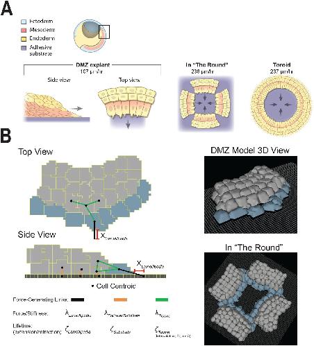Fig. 1.Modeling Xenopus mesendoderm tissue. (A) Illustration of gastrula-stage embryos and explants. Hemisected embryo at top, box indicates approximate location of dorsal marginal zone (DMZ) tissue explant dissected from the embryo and placed on an adhesive substrate; side and top views of adherent explant illustrate cellular organization of mesendoderm. Four separate DMZ explants are arranged as shown to generate the ‘in-the-round’ (ITR) geometry. The ITR approximates a single toroid or donut explant comprised of the entire mesendodermal mantle. Arrows indicate the direction of travel of the leading row cells in each preparation. Migration speeds taken from Davidson et al., 2002 are shown for each explant configuration. (B) Representative DMZ computational model images and schematic of critical parameters are shown. See Materials and Methods for the exhaustive parameter table and description of all parameters. Additional figures illustrating Xenopus laevis gastrulation and explant preparation procedures can be found in Davidson et al., 2002 and Sonavane et al., 2017. |