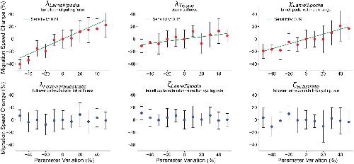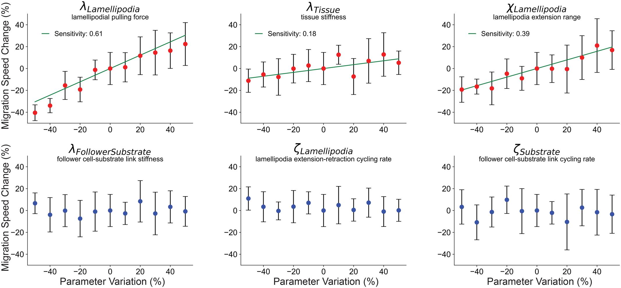 Fig. 2.Leading-edge parameters drive migration speed of the DMZ explant. One-dimensional sensitivity analysis of selected key parameters responsible for the migratory behavior of the explant: (lLamellipodia) lamellipodial pulling force, (lTissue) tissue stiffness, (χLamellipodia) lamellipodial extension distance, (lFollowerSubstrate) follower cell–substrate attachment stiffness, (ζLamellipodia) lamellipodial extension–retraction rate, and (ζSubstrate) follower cell–substrate attachment cycling rate. Parameter values ranged from −50% to +50% from baseline by equation reference ±% *reference, n=10, markers show means±s.d. Red markers indicate P<0.05 by one-way ANOVA. Sensitivity given as slope of linear regression line (green) through parameters identified as significant via one-way ANOVA. See Materials and Methods for additional parameter details. |