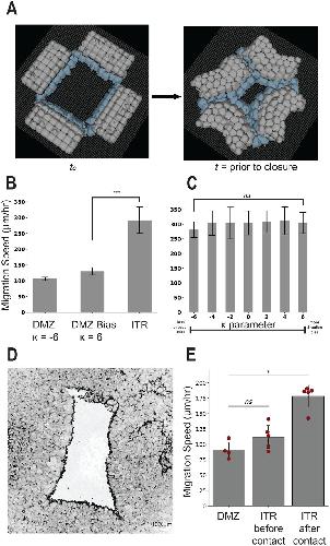 Fig. 4.‘In-the-round’ geometry increases migration speed of the DMZ explant. ITR experiment configuration. (A) Representative images displaying model initialization at t0 and time to closure. (B) Migration speed comparison with the DMZ explant with and without bias (K=−6,6), *** indicates P<0.001 by independent samples t-test. (C) Effects of modulating the cohesotaxis parameter upon tissue migration speed in the ITR configuration, ns indicates P>0.05 by one-way ANOVA. Simulations results in panels B and C include n=10, mean±s.d. (D) Representative image from a biological ITR experiment, before time to closure. (E) Experiments comparing migration speed of a single linear DMZ explant and the explants in an ITR configuration before and after collision as performed in Davidson et al., 2002, n=4, mean±s.d., significance at P<0.05 by independent samples t-test. |